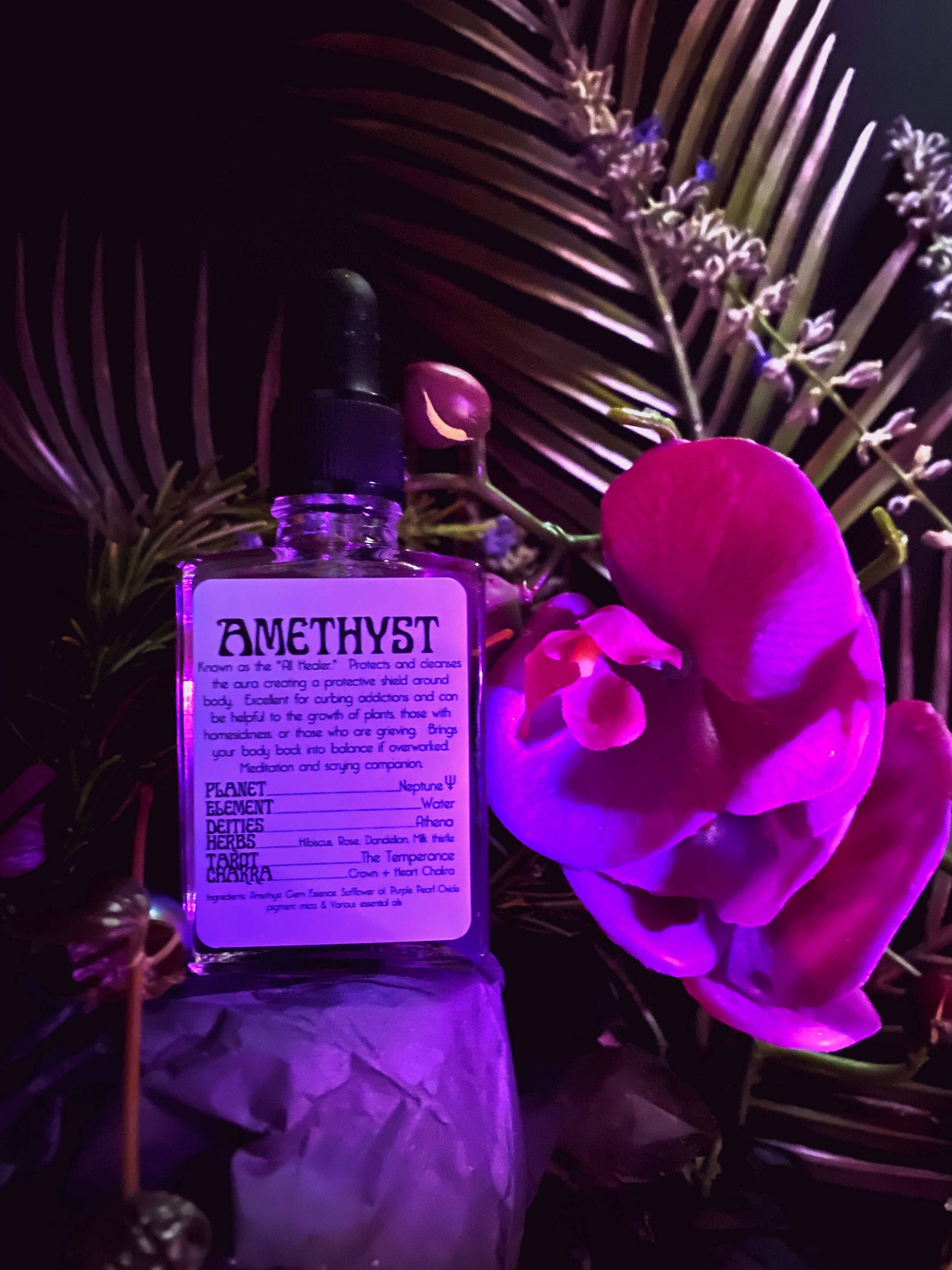 Ingredients: Amethyst Gem Essence, Safflower oil, Apricot Kernel oil, Purple pearl Oxide Pigment, & Various Essential oils + Reiki energy.