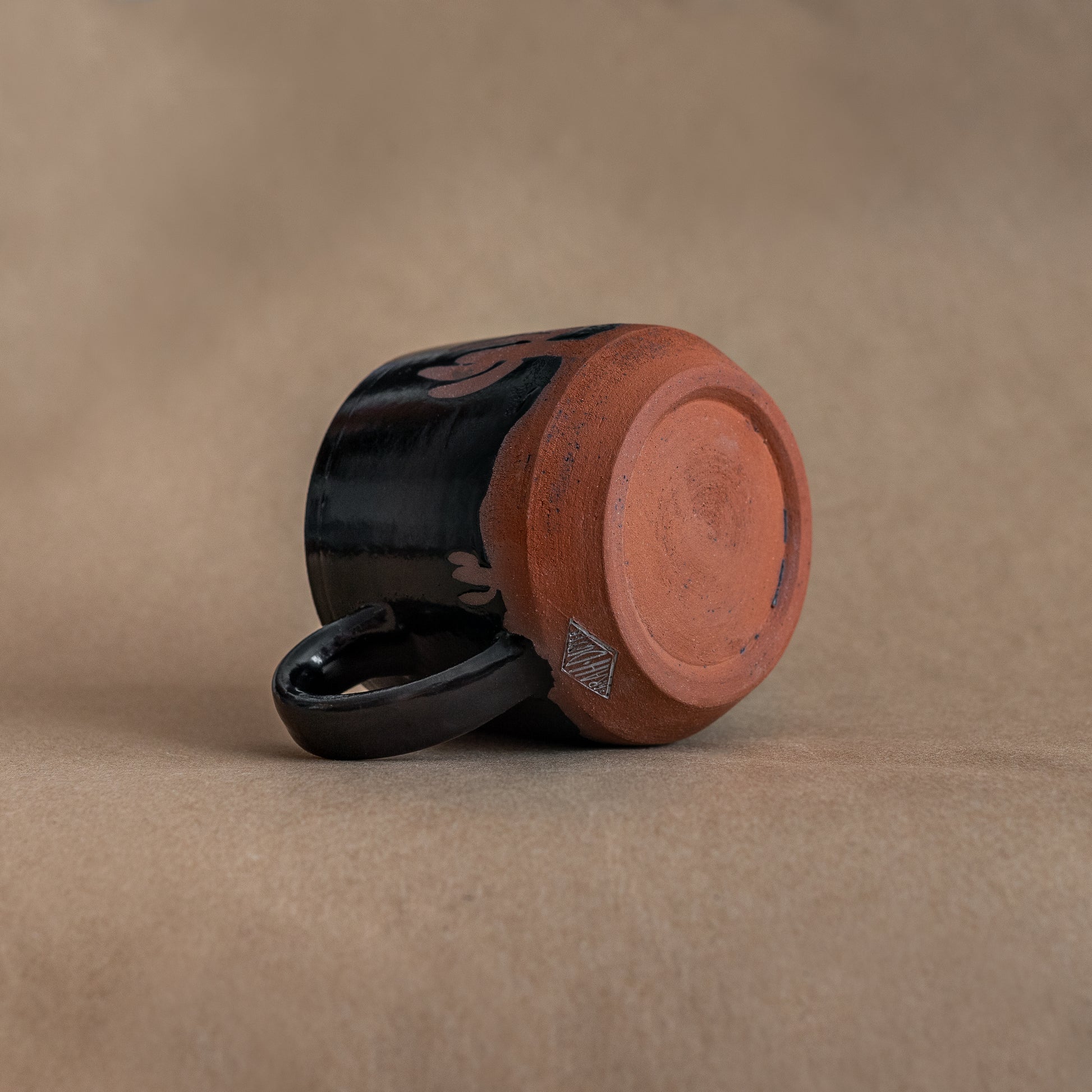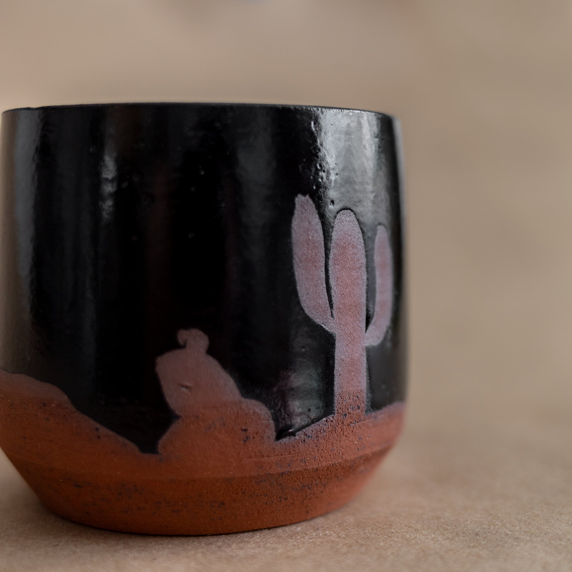A large red stoneware mug, thrown by Sarah Duyer, and finished with a shiny black food safe glaze featuring a waxed desert silhouette, leaving the raw texture of the clay exposed.