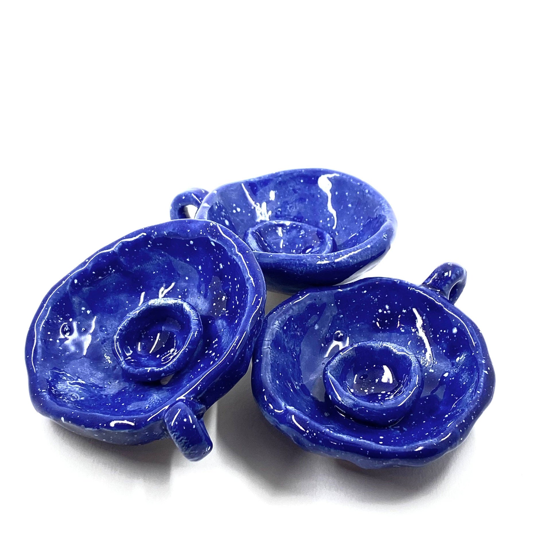Ceramic + blue glaze | approx. 2.2" diameter + handle x .6" tall
