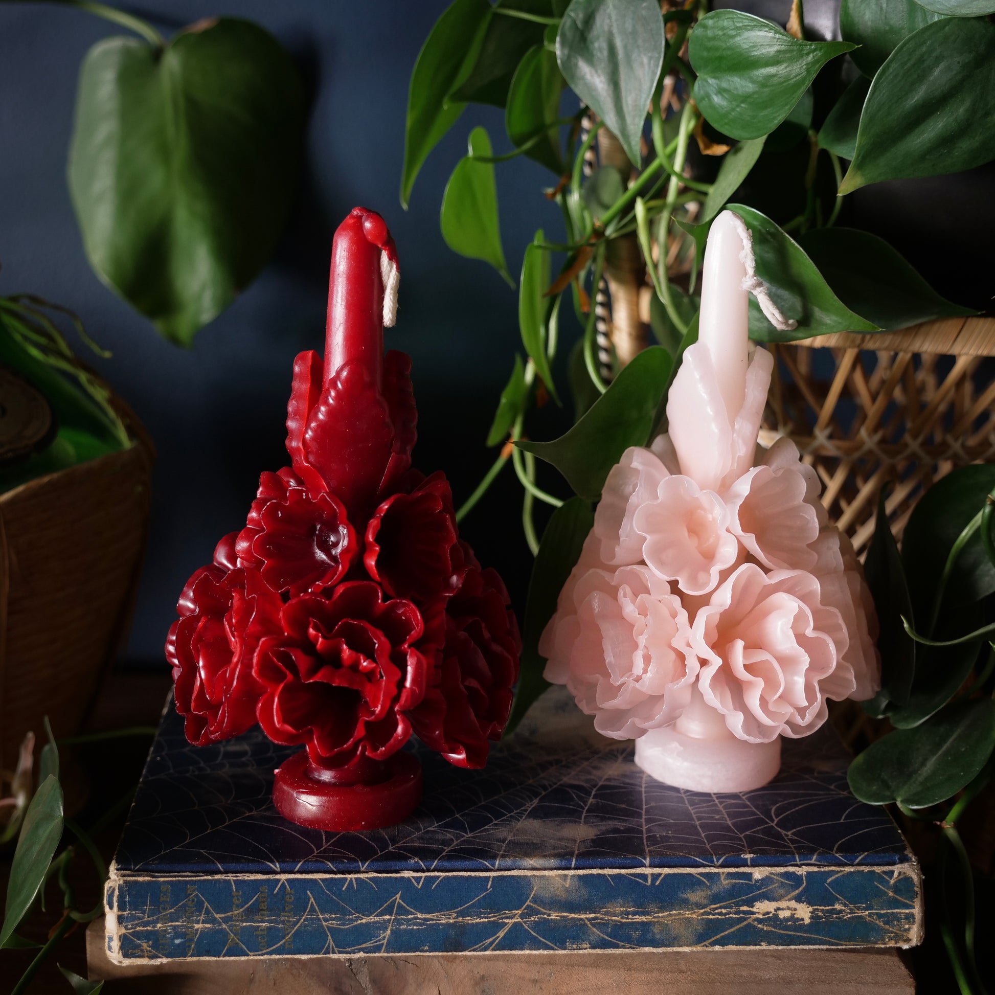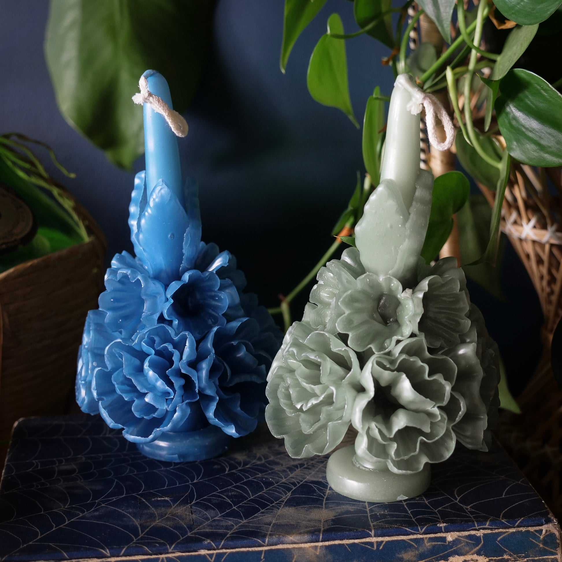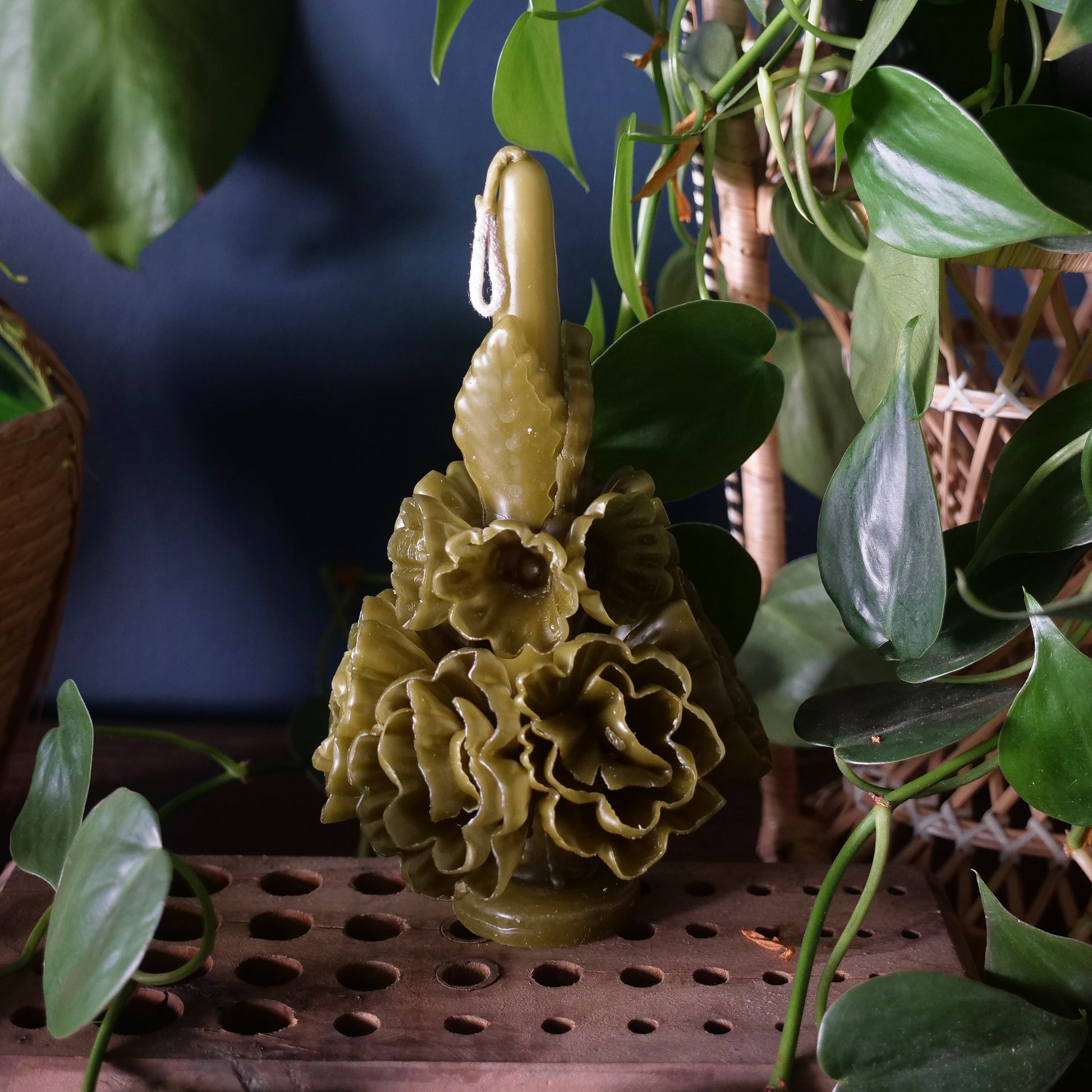 Handmade Oaxacan candle decorated with hand formed marigolds. Traditionally used for celebrations, can be burned or placed on an altar.