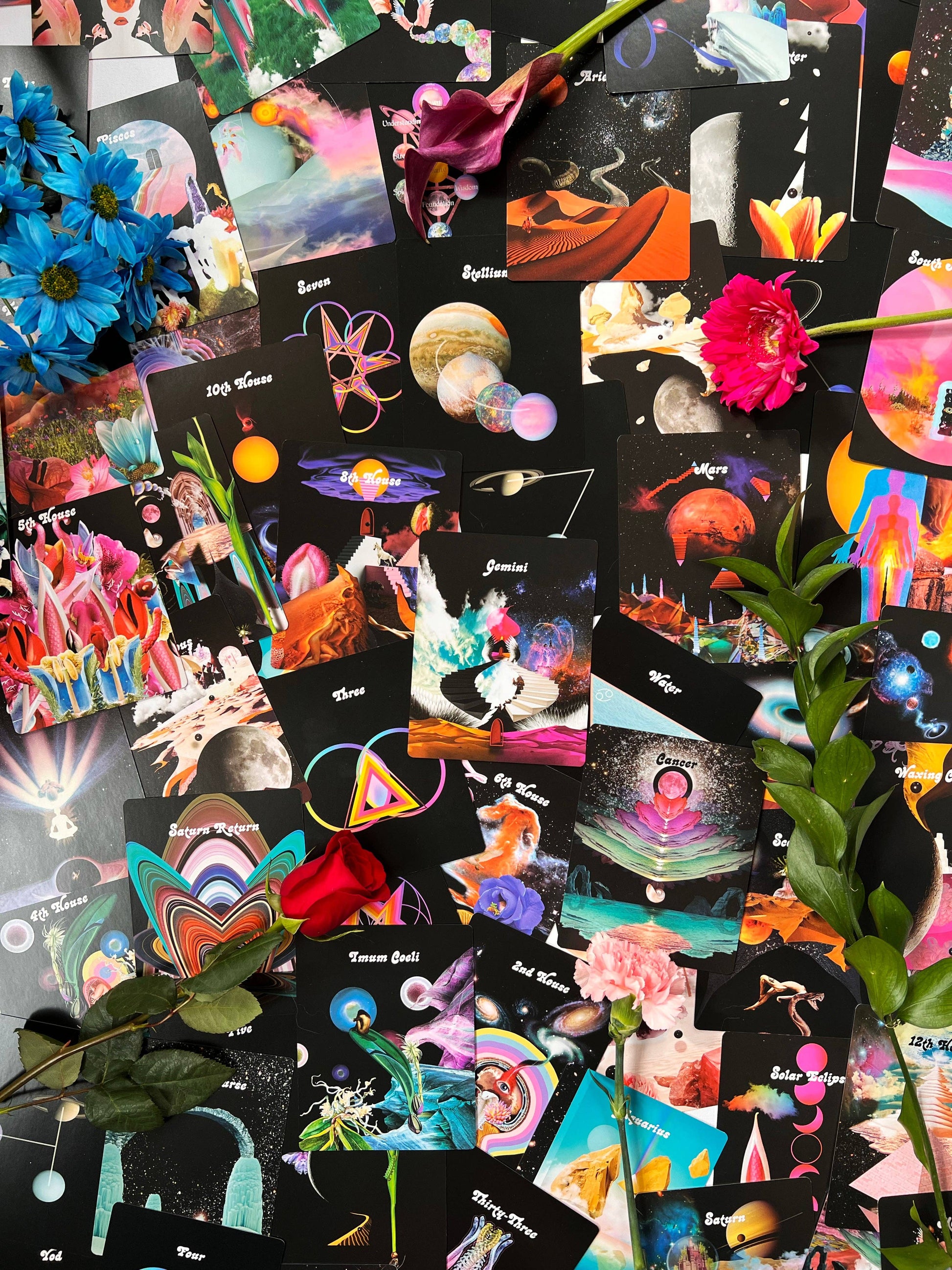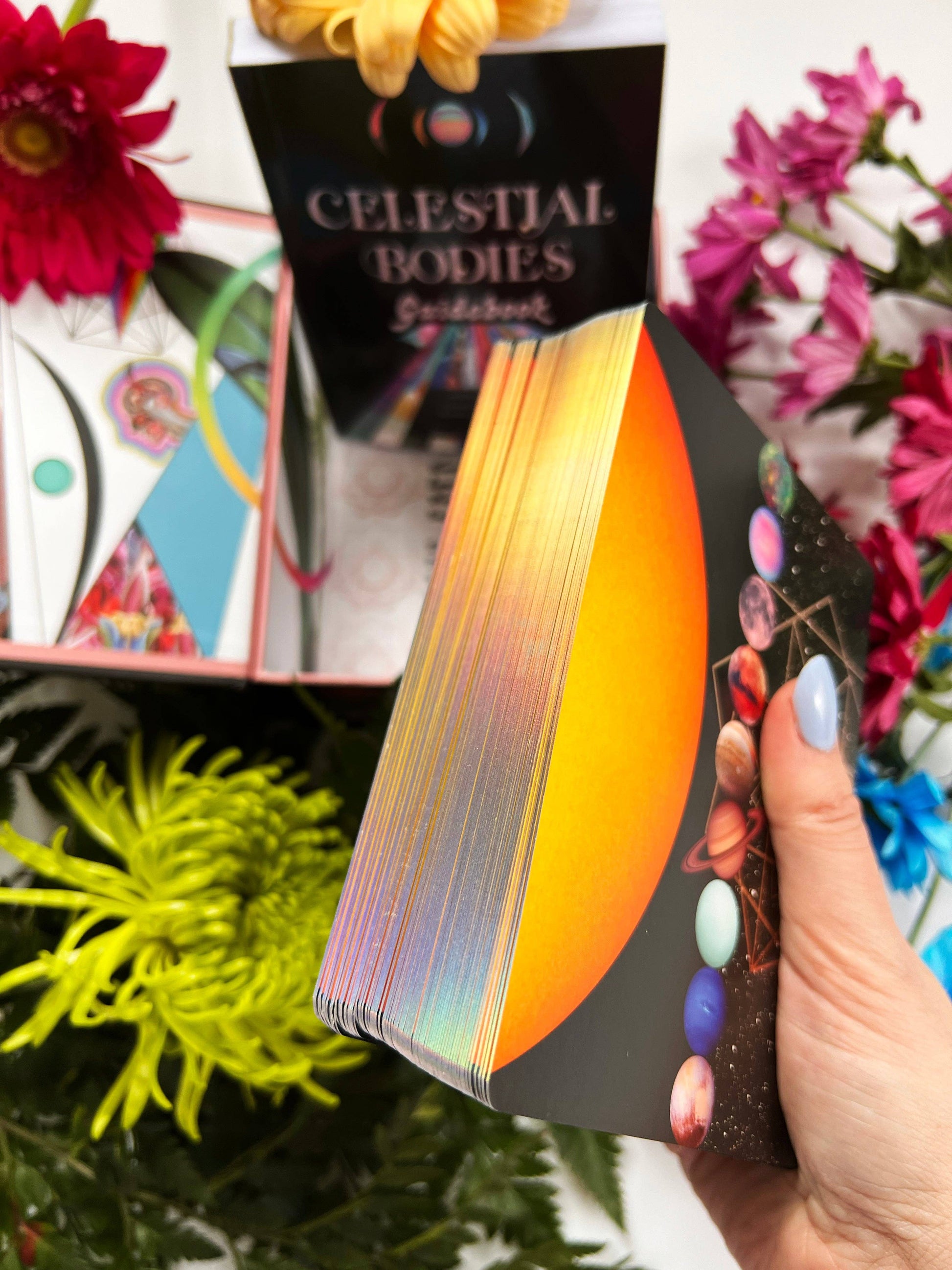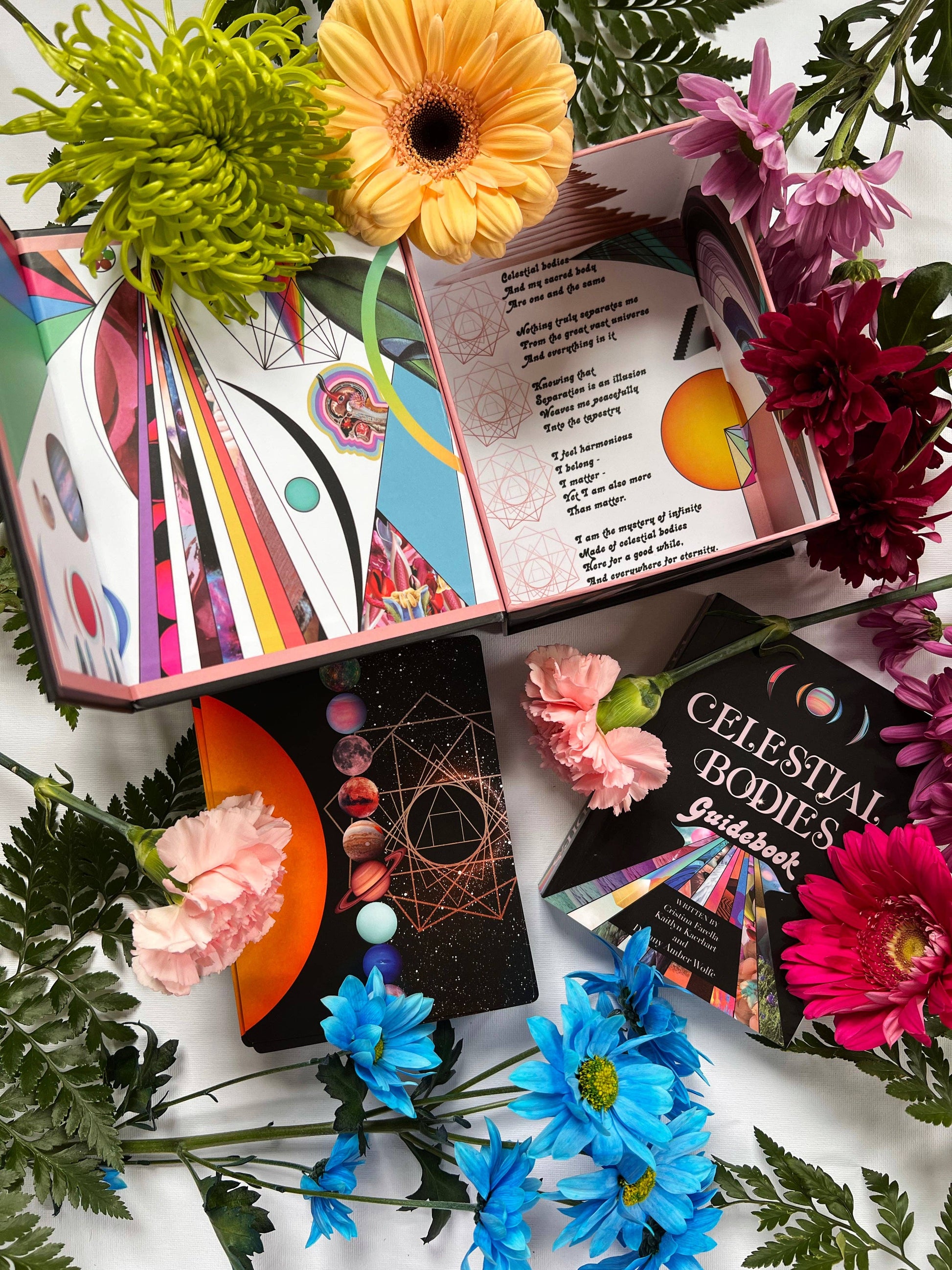 Celestial Bodies is an oracle deck, an interactive astrology learning tool as well as a deep dive into the realm of numerology, and how they work in tandem. Fully integrating beautiful cosmic landscape artwork and in-depth astrology and numerology information in the hefty guidebook. The card artworks were intuitively created based upon Devany's connection with astrological energies, and the guidebook was a wonderful collaboration between Devany, Cristina Farella of Eighth House Astrology and Kaitlyn Kaerhart, numerologist. In the 370 page guidebook, all foundational aspects of astrology are covered (signs, houses, planets, moon phases, aspect + aspect patterns etc) as well as special sections on eclipse seasons, retrogrades, Saturn return and so much more! The numerology section gives you a full understanding on how to calculate your numbers, and what they all mean.