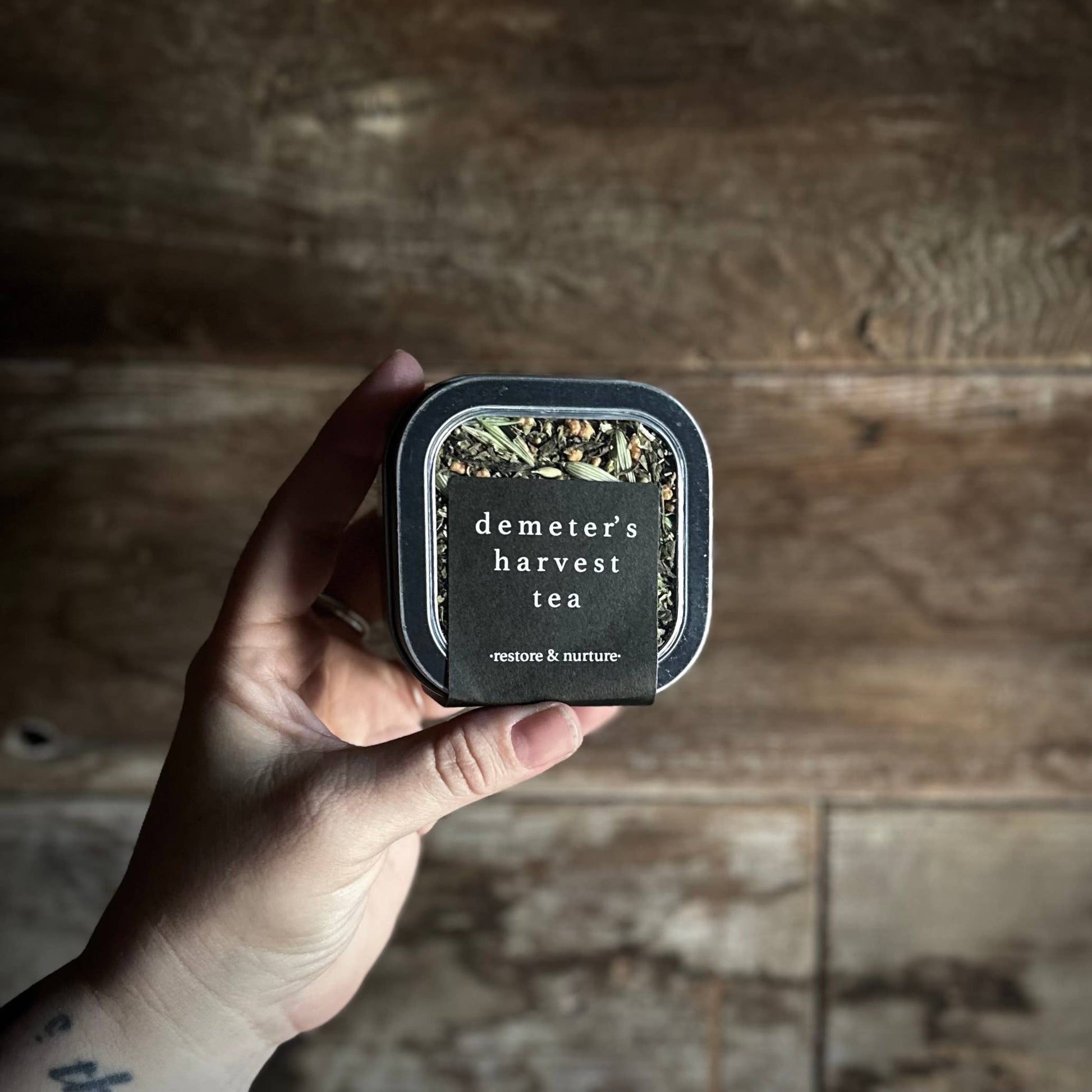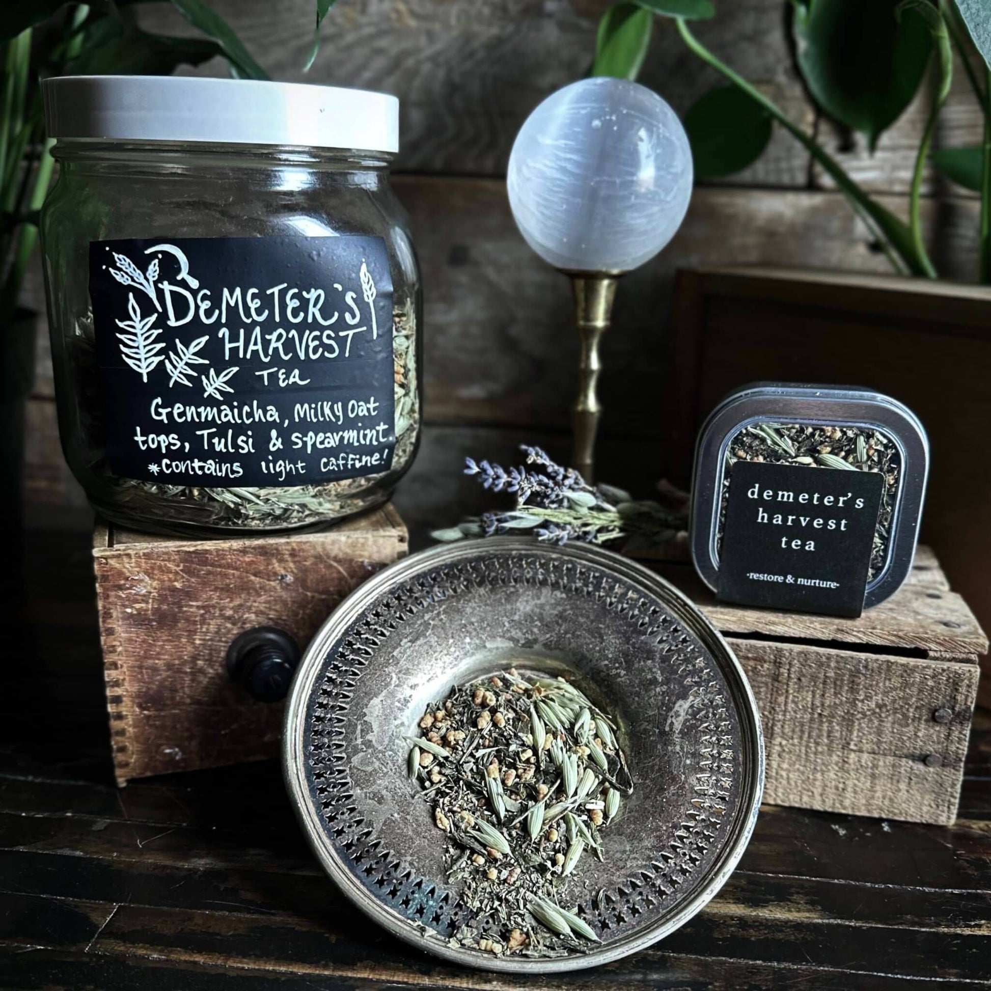Demeter is the goddess of the harvest, grains, cycle of life & death, sacred law (justice) & fertility of the land; Demeter is also an important character in Persephone's tale! Handcrafted in Denver, this tea blend can be used year round to nourish and support you in harvesting the bounty of your workings, restoration and connection with any aspect of Demeter.