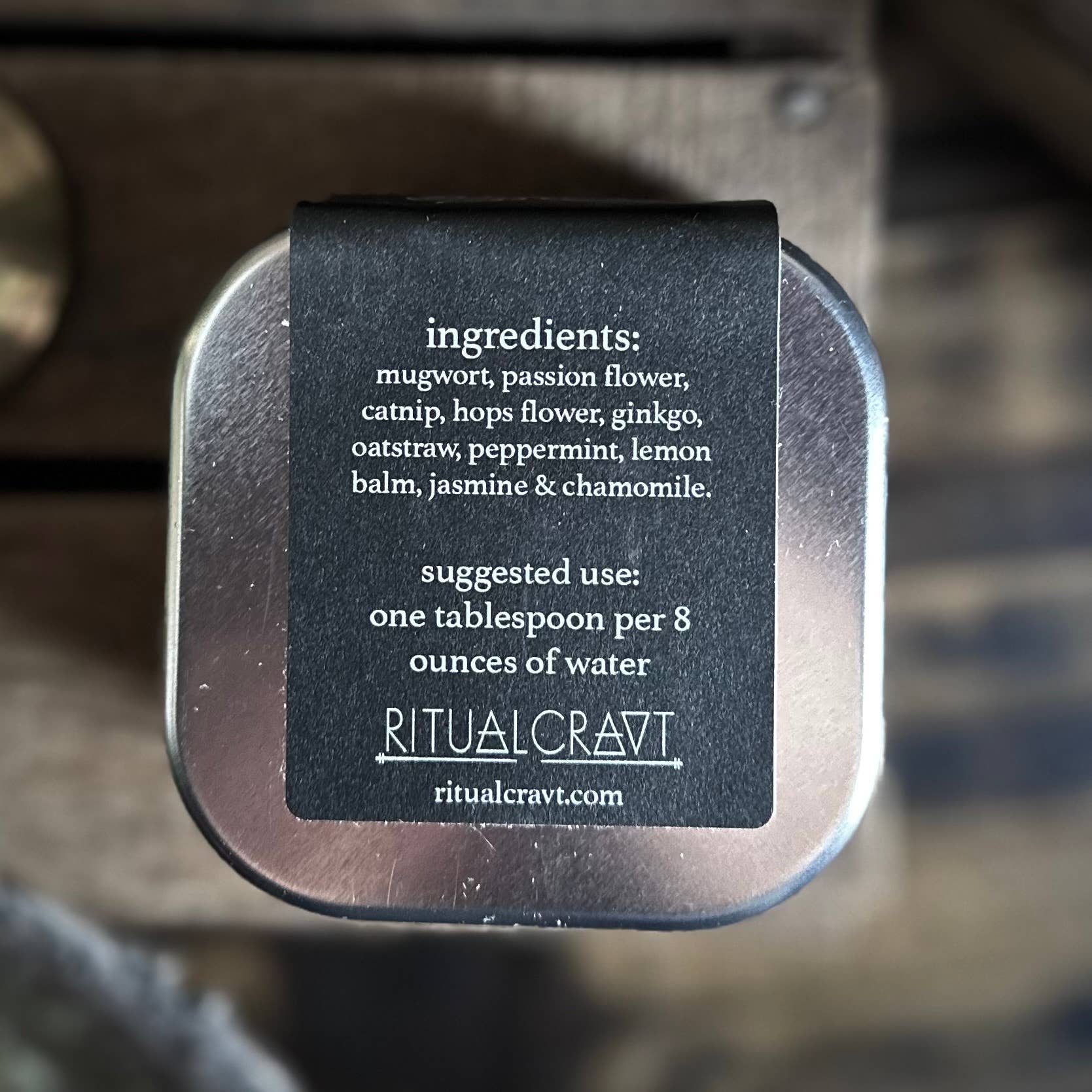 Ingredients: mugwort, passion flower, catnip, hops flower, ginkgo, oat straw, peppermint, lemon balm, jasmine, and chamomile.