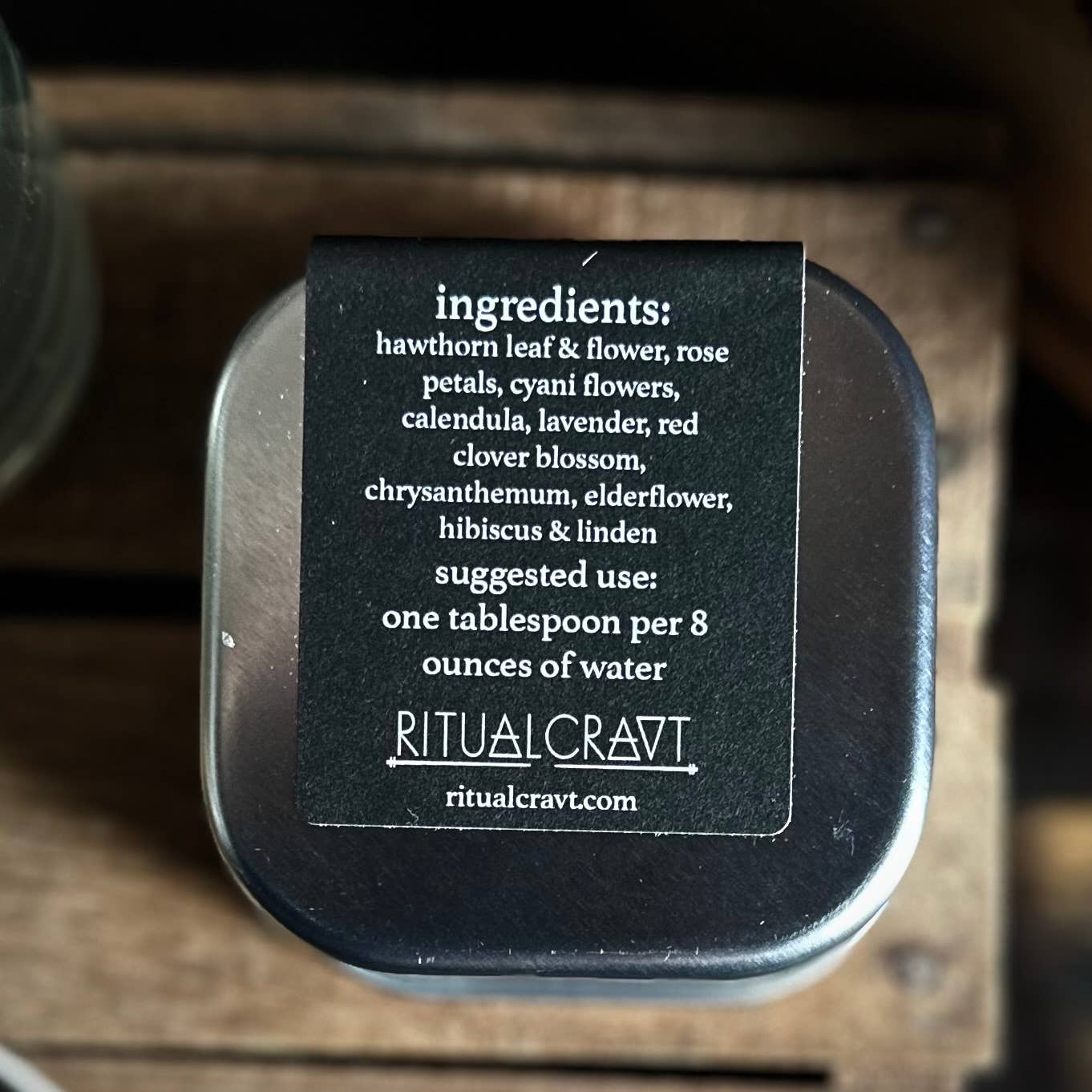 Ingredients: hawthorn leaf & flower, rose petals, cyani flowers, calendula, lavender, red clover blossom, chrysanthemum, elderflower, hibiscus, and linden.