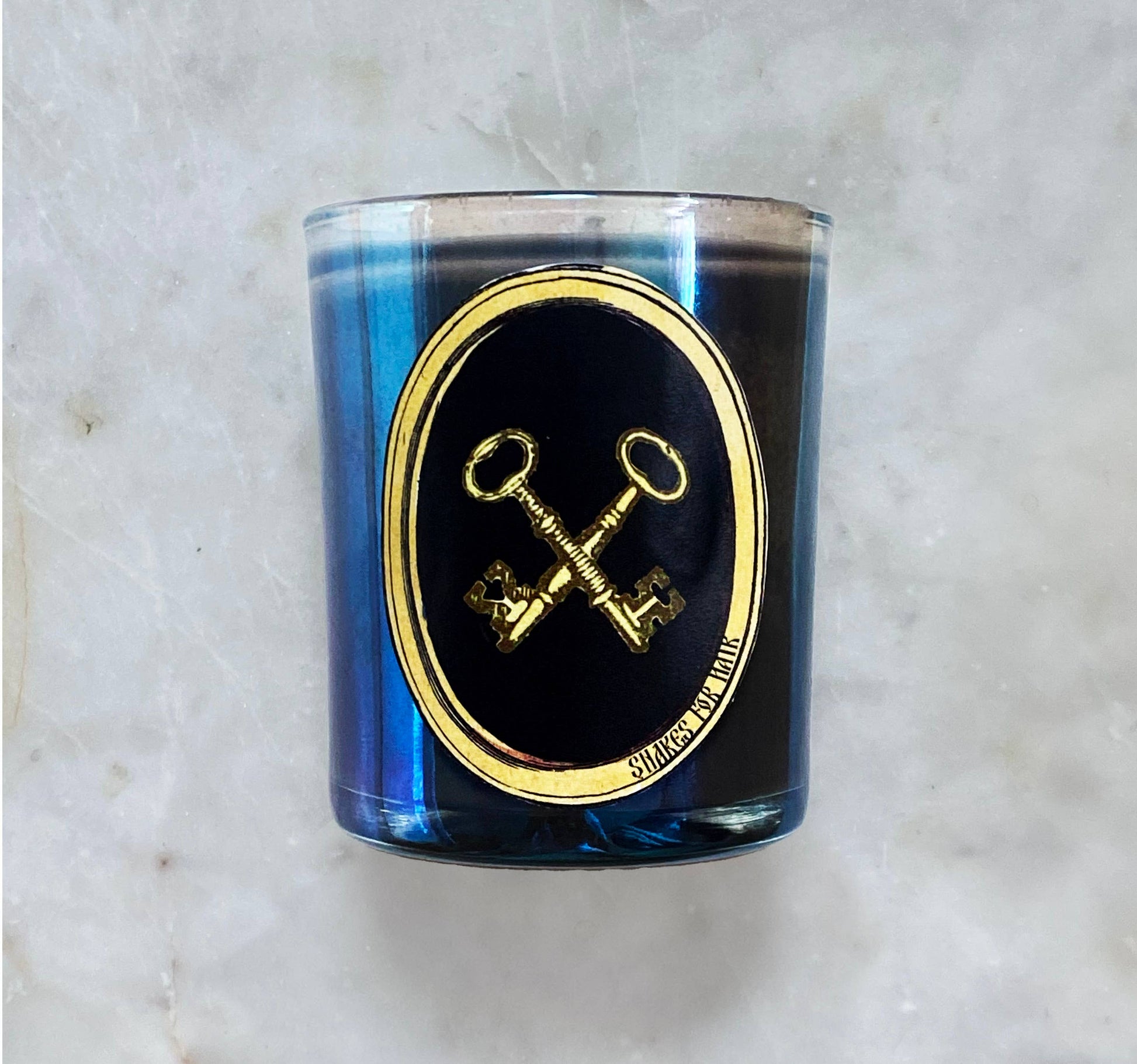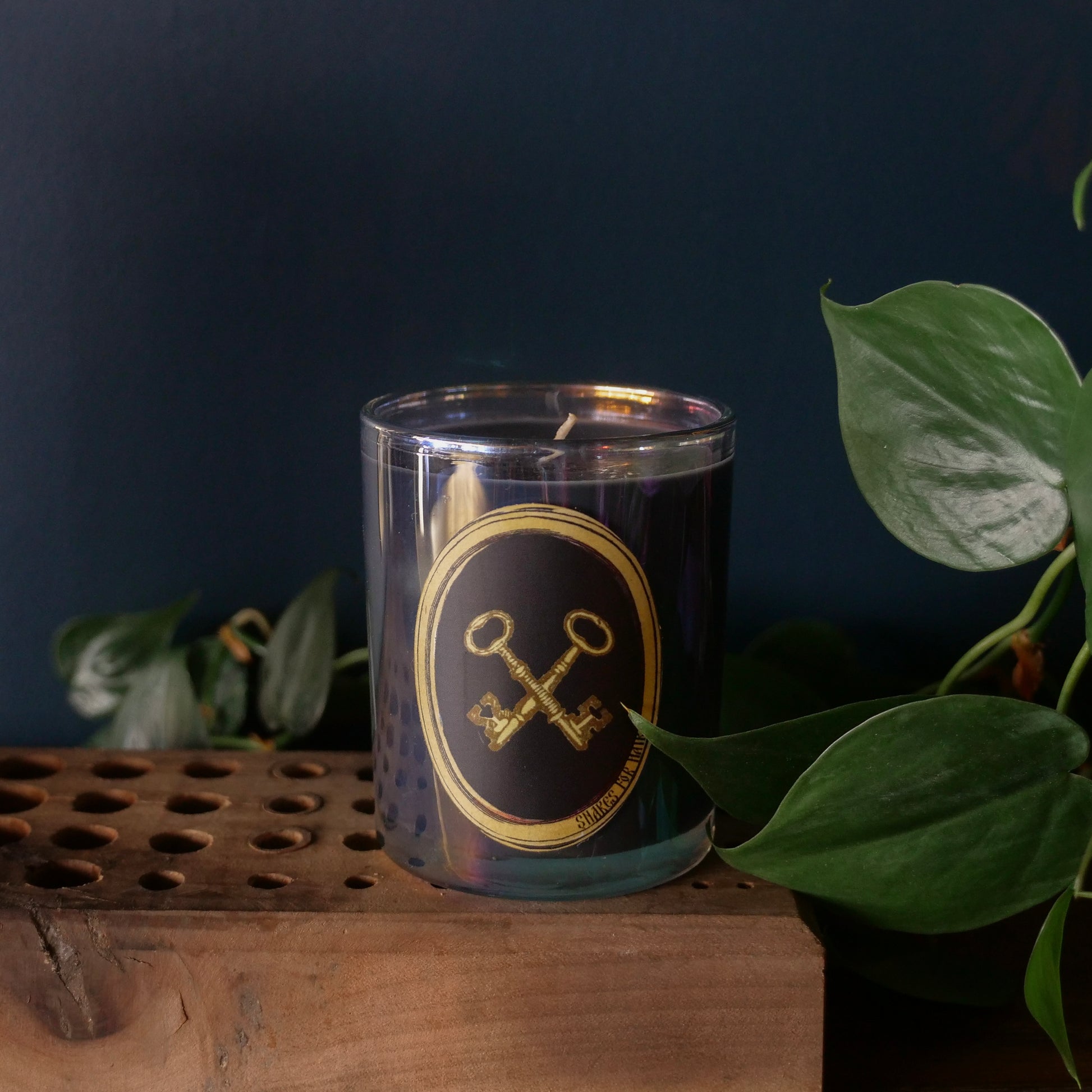 A more diminutive and decorative version of Hecate altar candle. In Greek mythology, the triple goddess Hecate controls witchcraft, crossroads, the underworld, dreams, and death. Her symbols are keys that unlock the gates between realms. She is connected to all phases of the moon but is typically associated with new moon. Lightly-scented in honeysuckle for psychic powers, money, and protection, and jasmine for love, money and prophetic dreams. And like Hecate, jasmine is connected to the moon. Made of 100% black soy wax encased in an iridescent glass jar.