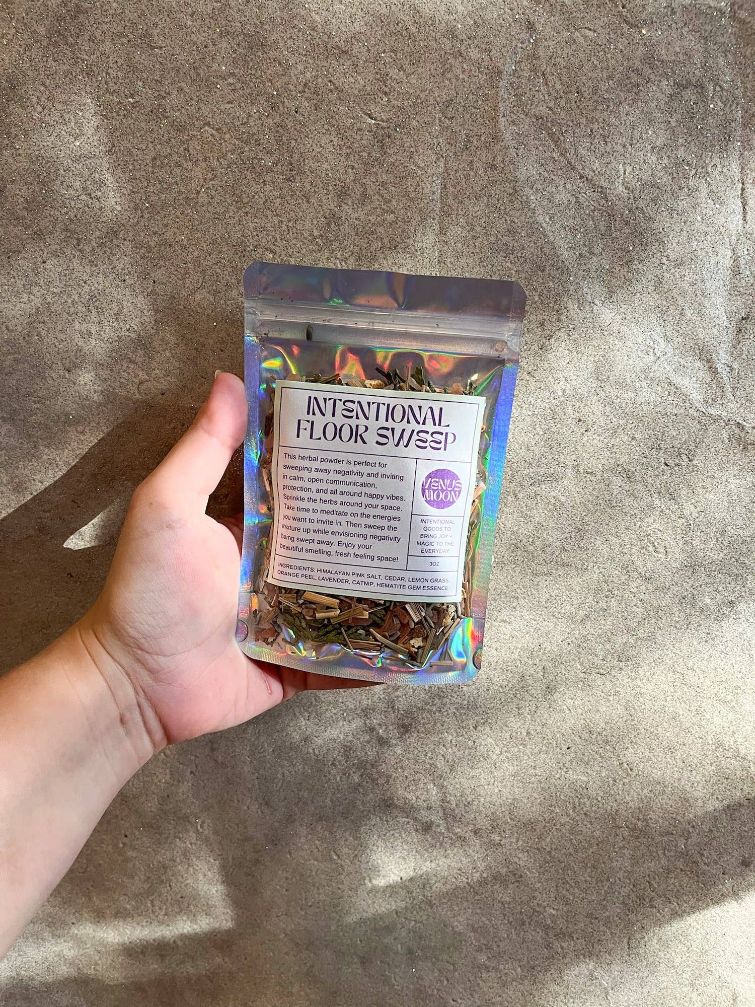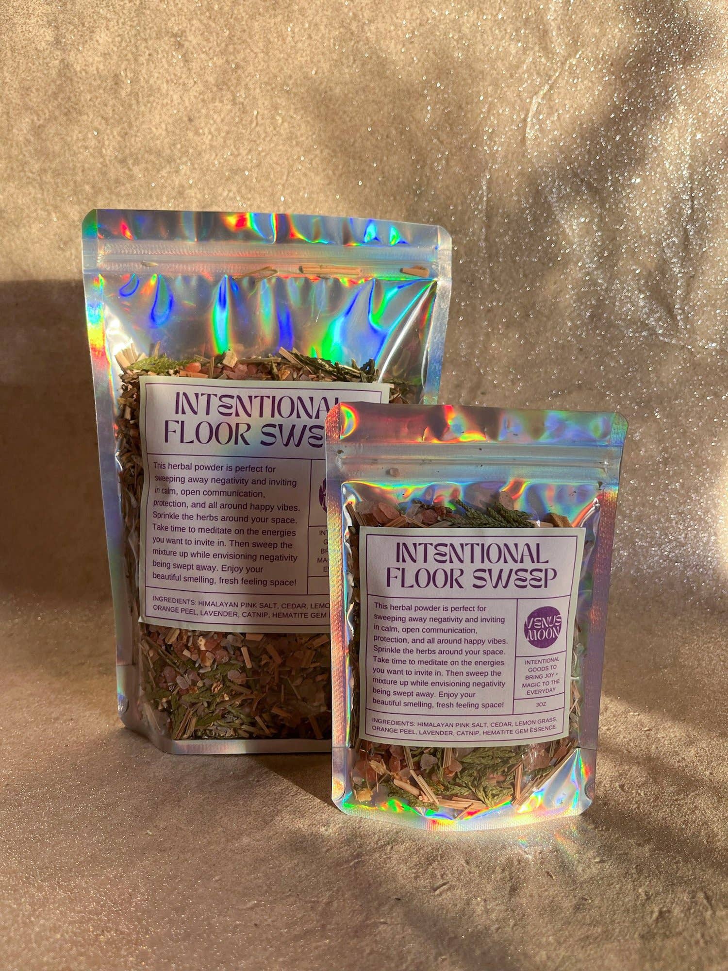 This herbal powder is perfect for sweeping away negativity and inviting in calm, open communication, protection, and all around happy vibes. Sprinkle the herbs around your space. Take time to meditate on the energies you want to invite in. Then sweep the mixture up while envisioning negativity being swept away. Your space will feel fresh and smell beautiful every time. Floor sweeps are an amazing way to intentionally cleanse your home with out the use of smoke which some people or animals might be sensitive to.