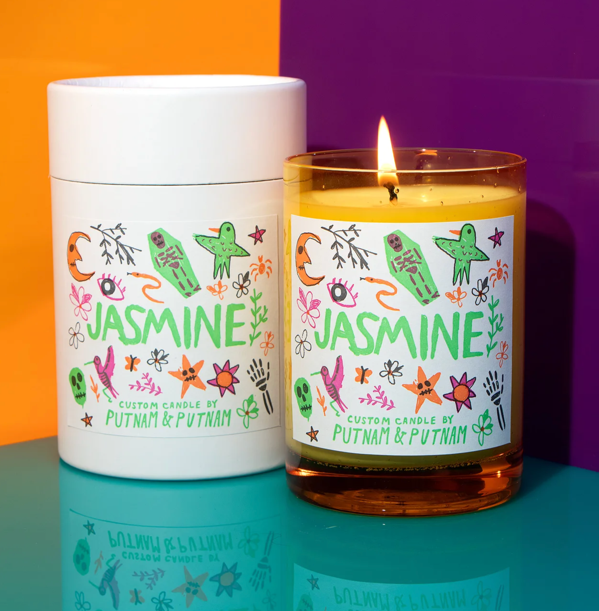 Each single note scented candled is hand poured and crafted in Los Angeles by Putnam Design. Amazing labels on colored glass jars. approx. 40 hour burn time