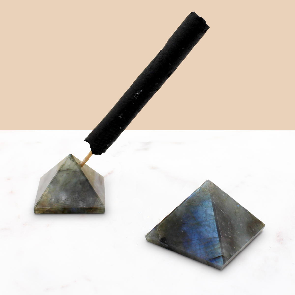 A crystal pyramid drilled to accommodate most bamboo incense sticks. Pyramid is approx 1.5" wide. Pairs perfectly with Inca Aromas incense sticks.