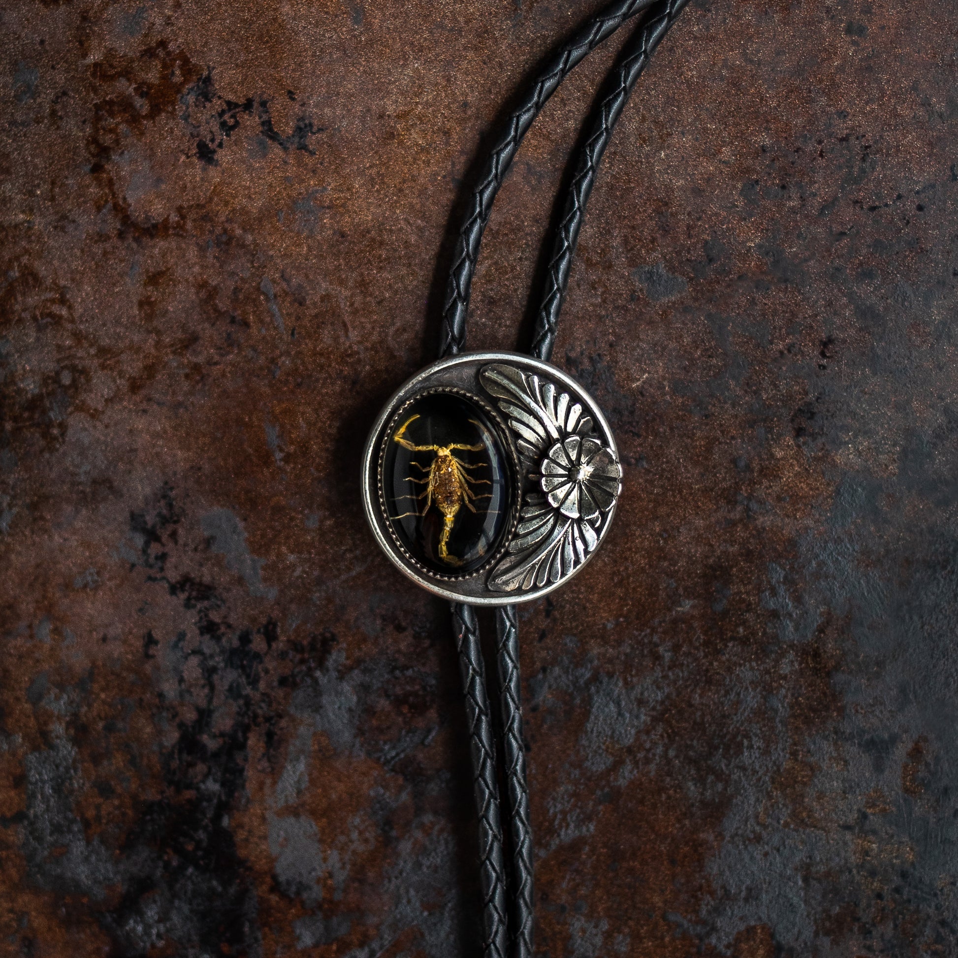 A brown scorpion set in resin and nestled by two hand cast leaves and flower. Bolo is slightly over 1 3/8" tall, and comes on a vintage bolo cord with handmade sterling silver tips.