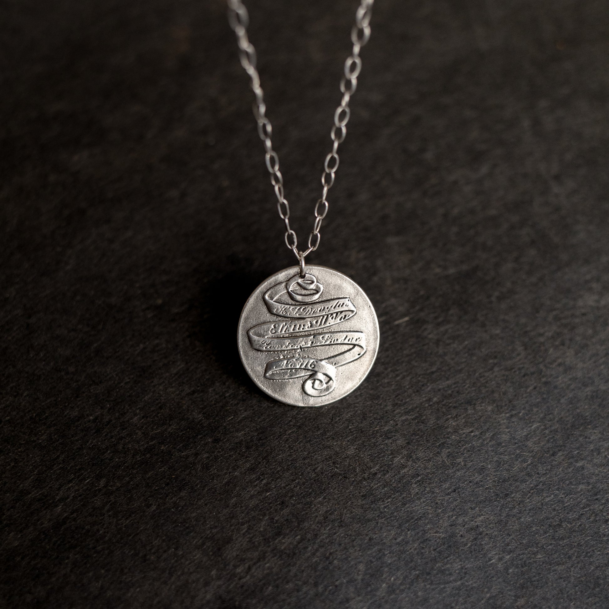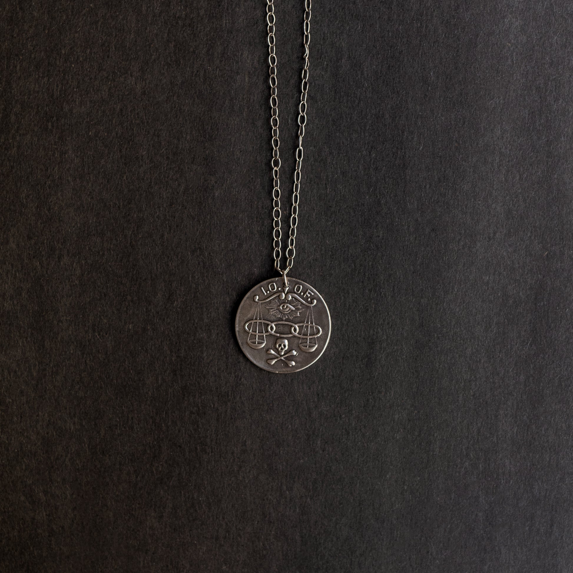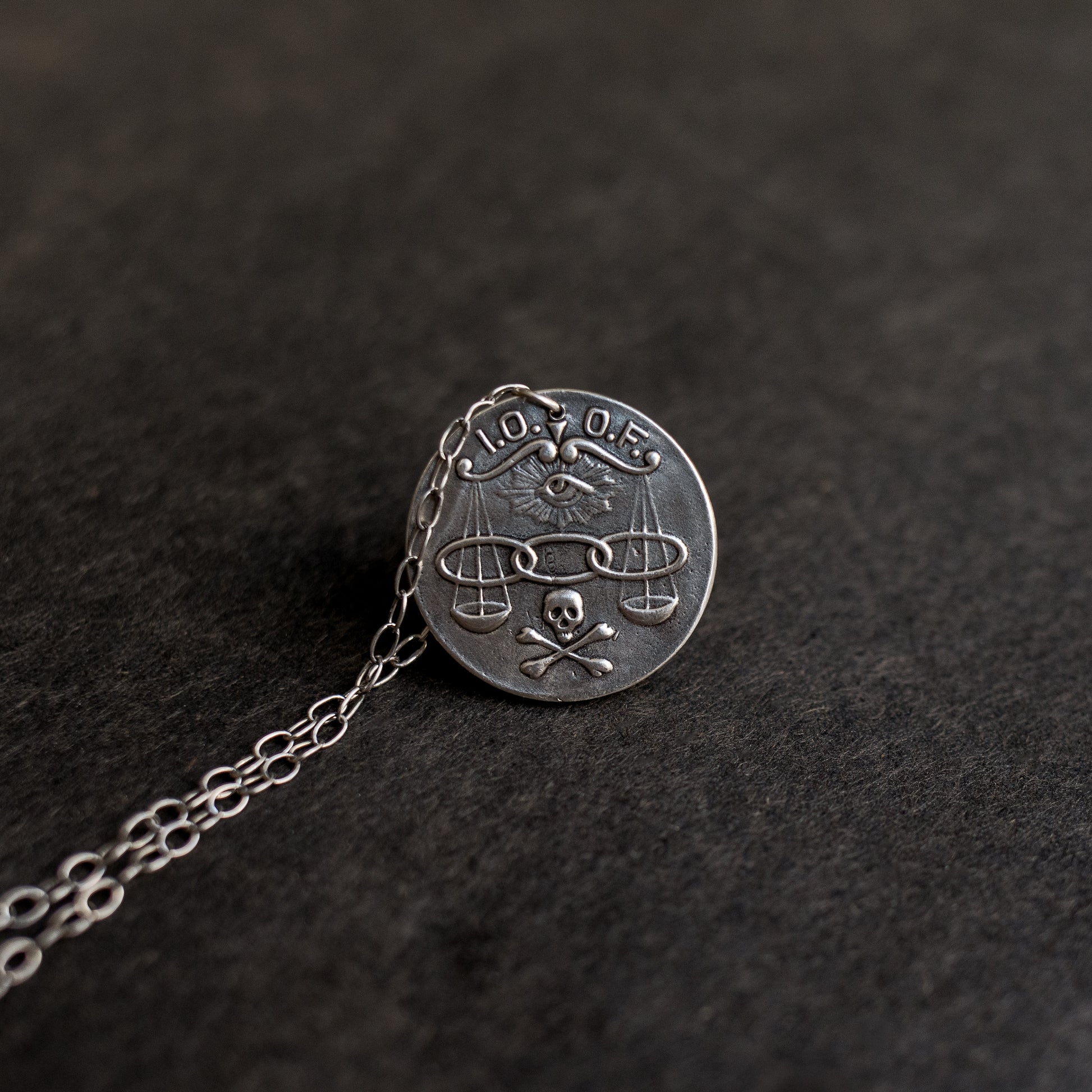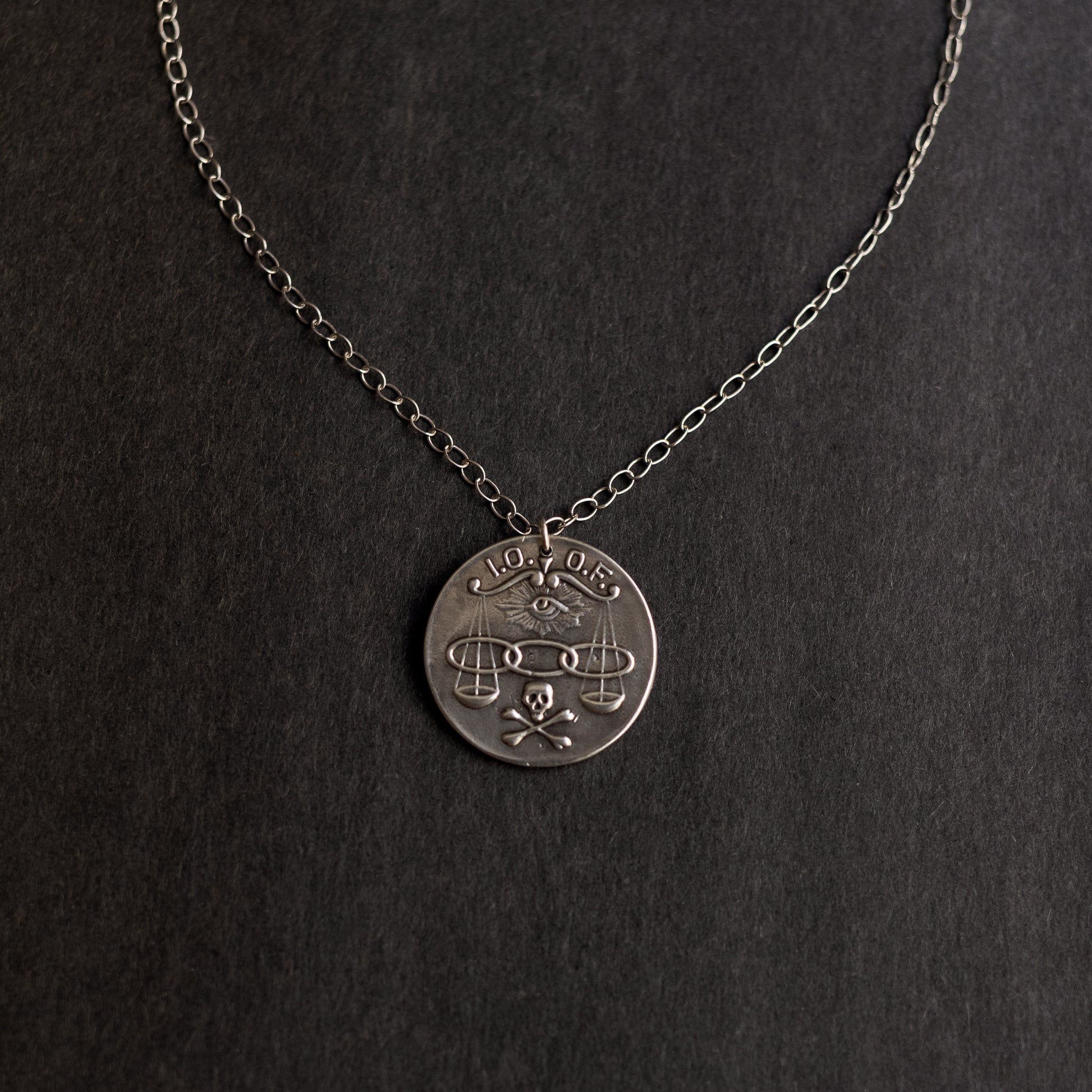 A cast replica of an antique oddfellows coin. Perfect for all occasions. Hangs on a 18" sterling chain and is approx 1".