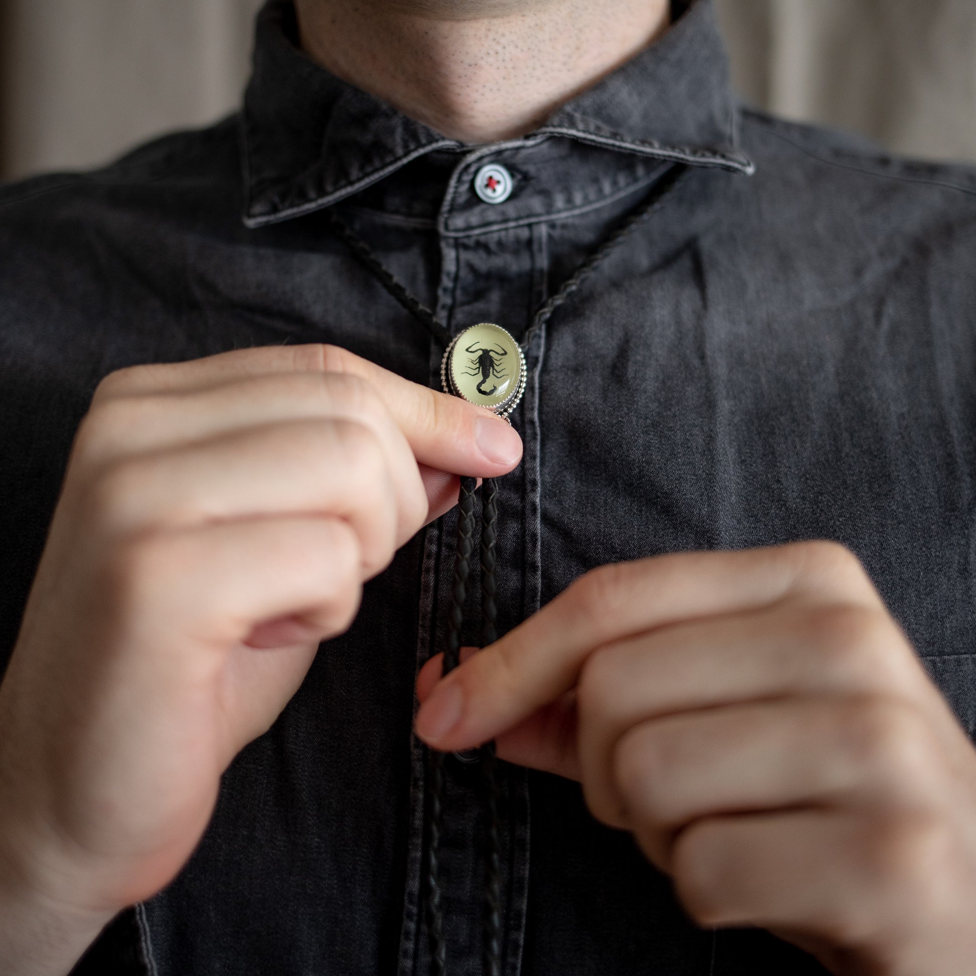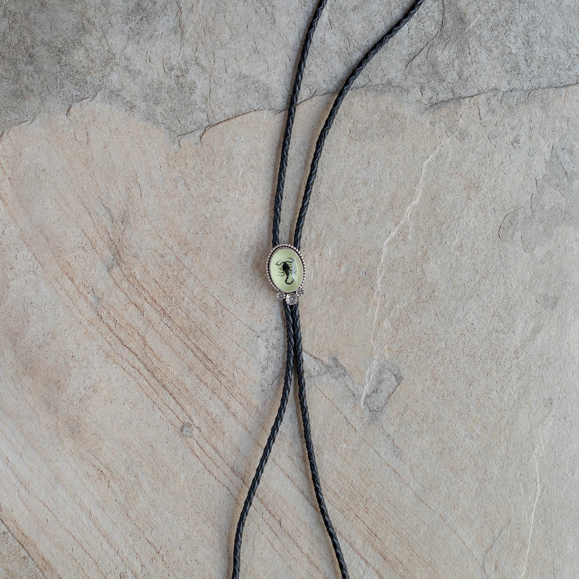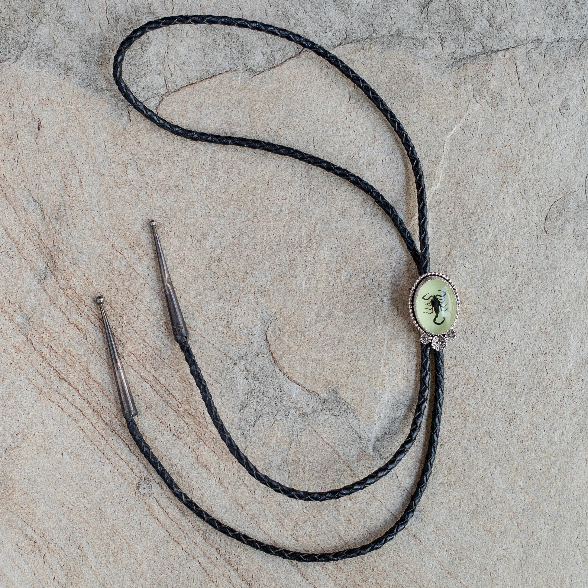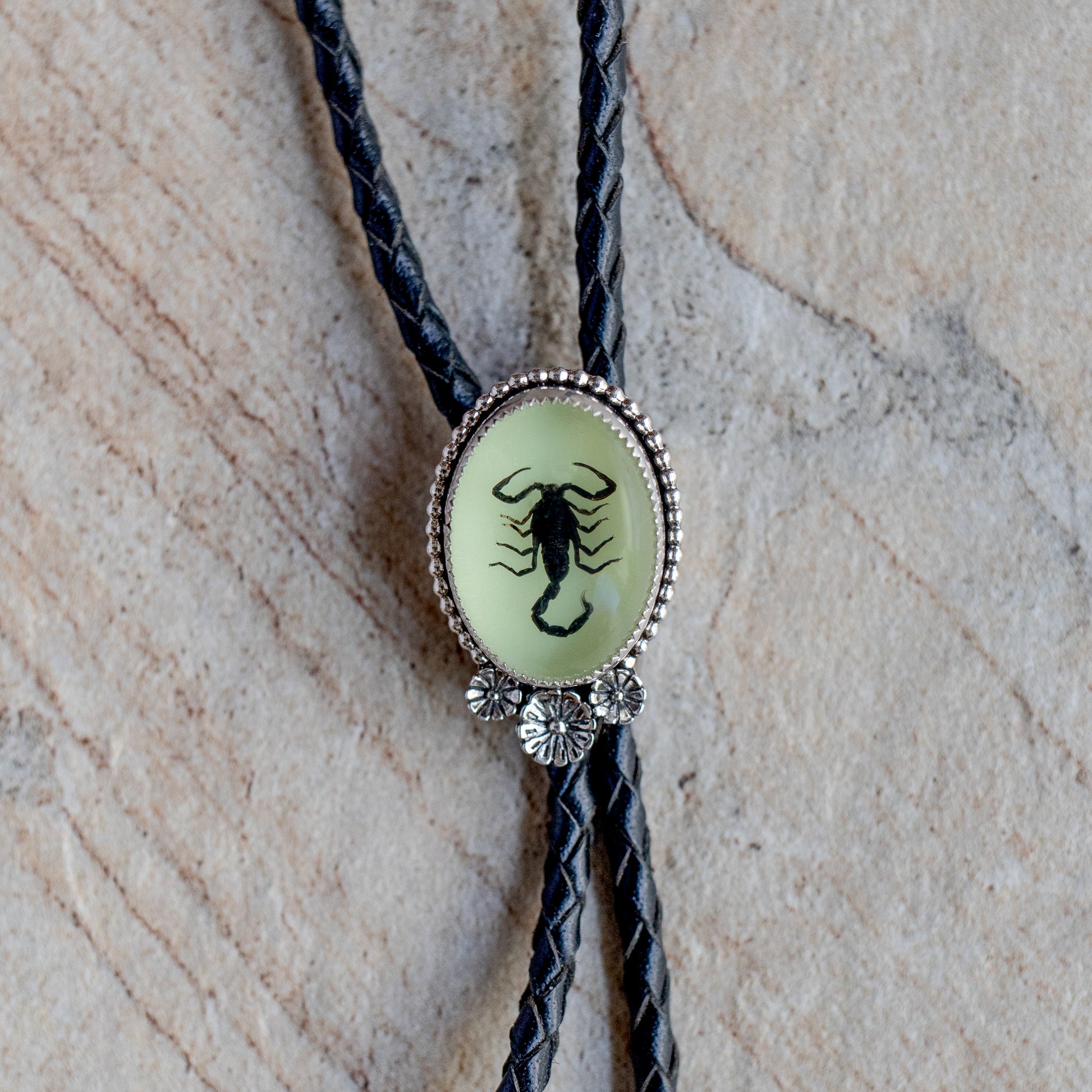 A black scorpion set in a cream, glow in the dark resin and hand cast sterling silver flowers. Included is a vintage leather bolo cord with sterling silver tips, but a cotton cord option is available. Bolo slide is approx 1.25" tall.
