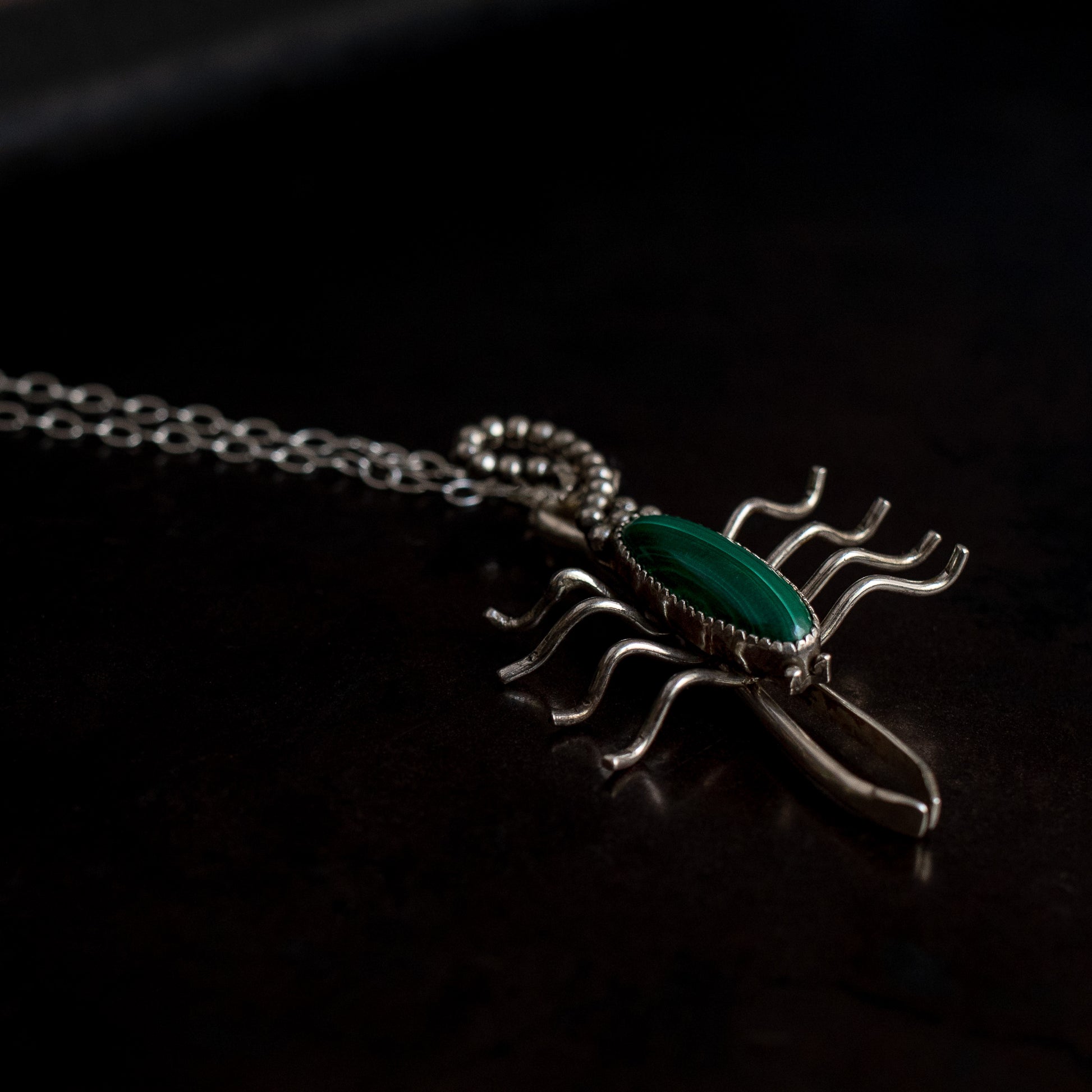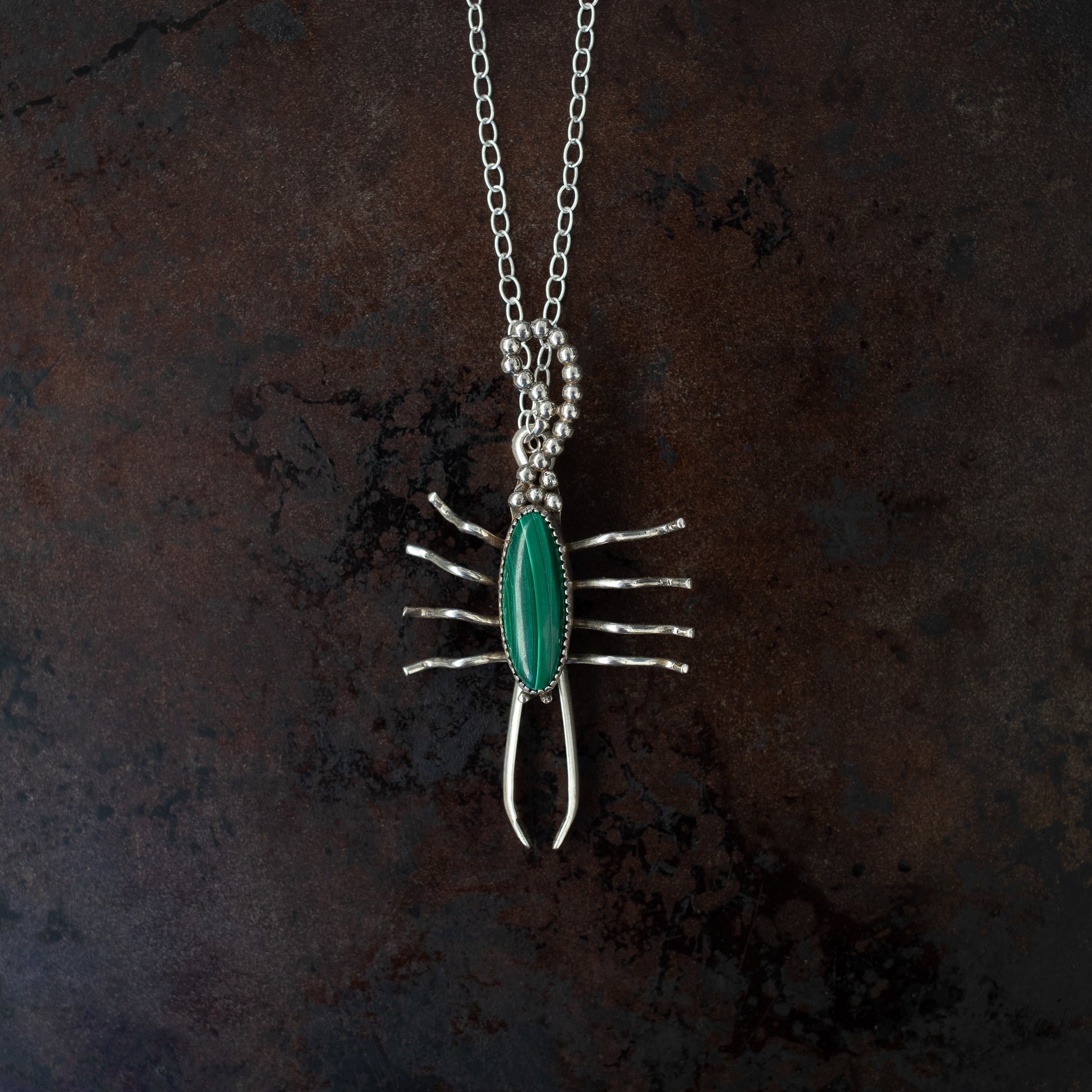 A little scorpion buddy to help you out with your extra curricular activities. Also just a cool pendant. Stone is approx 22 mm long, and comes on a 24" sterling silver chain.