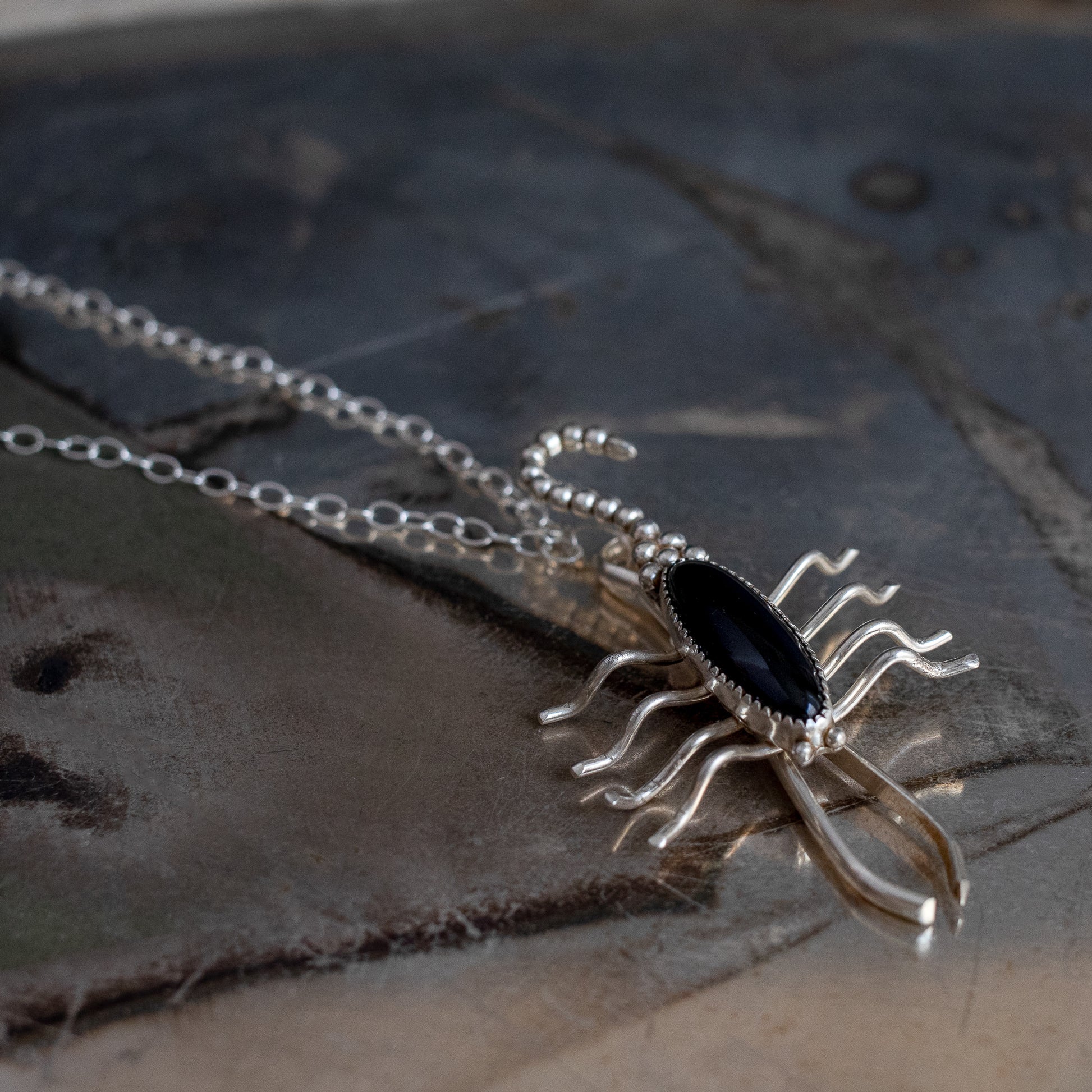 A little scorpion buddy to help you out with your extra curricular activities. Also just a cool pendant. Stone is approx 22 mm long, and comes on a 24" sterling silver chain.