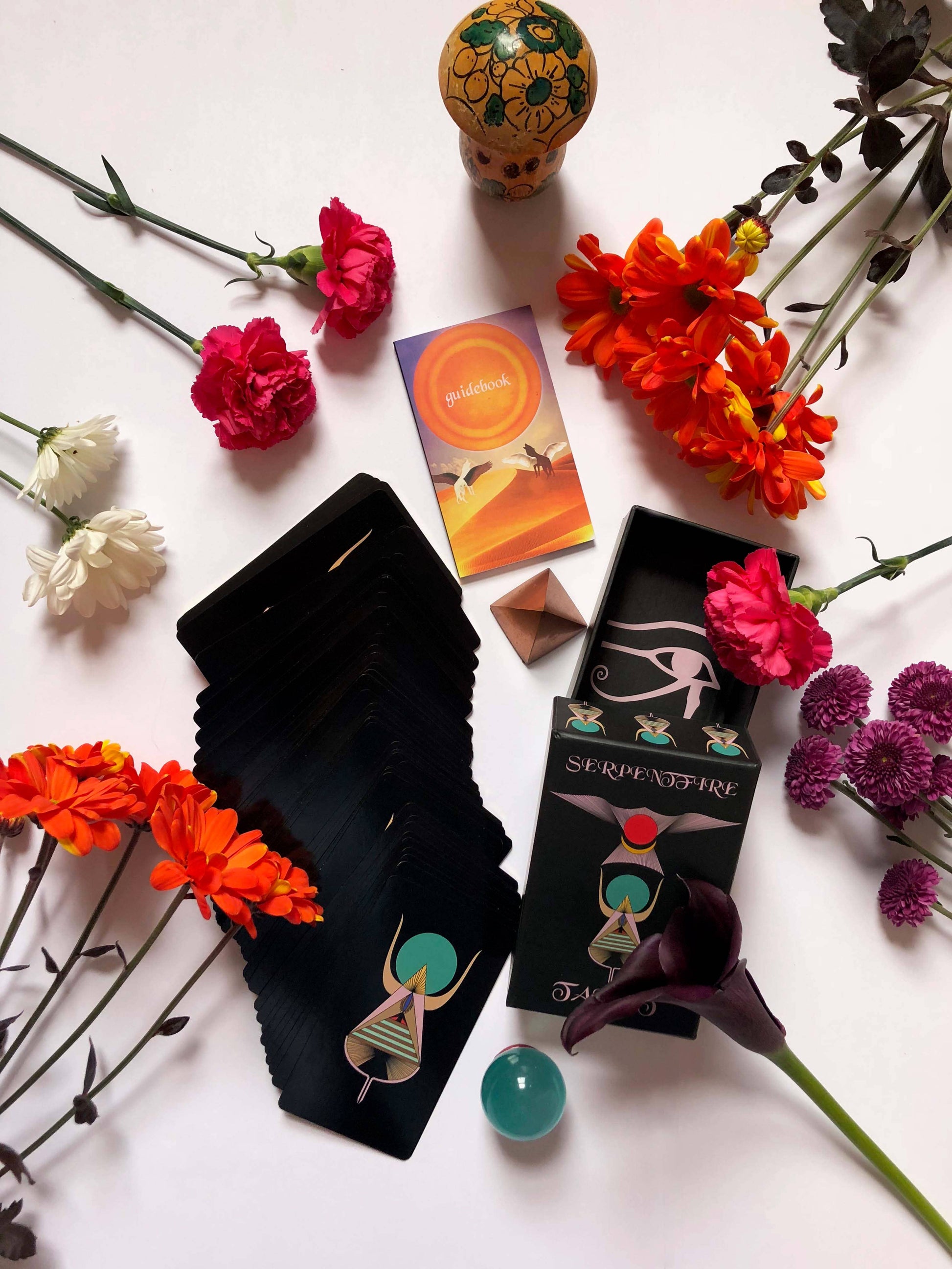 Rekindle your love for the divine feminine as you trace her footsteps through the majesty of the desert and vintage sci-fi dreamscapes. The artwork lends itself to traditional tarot symbolism - but for anyone who may need extra insight, the guidebook is extremely helpful in explaining what the visuals have to offer, as well as the meaning of the cards in their light (upright) and shadow (upside down) positions. Serpentfire Tarot is the first deck from Devany Amber Wolfe with the first edition completed in 2014. 7th (and final!) edition