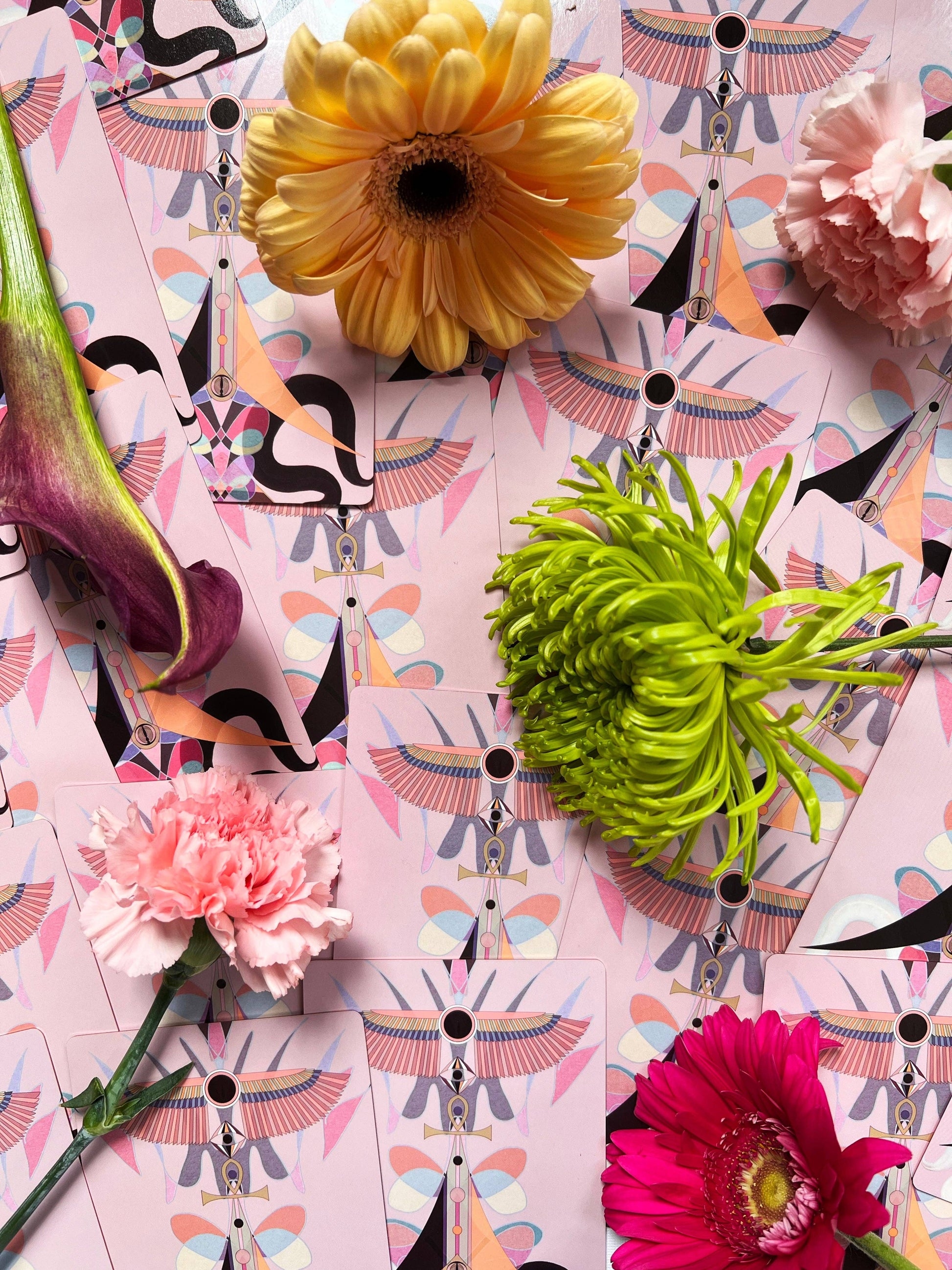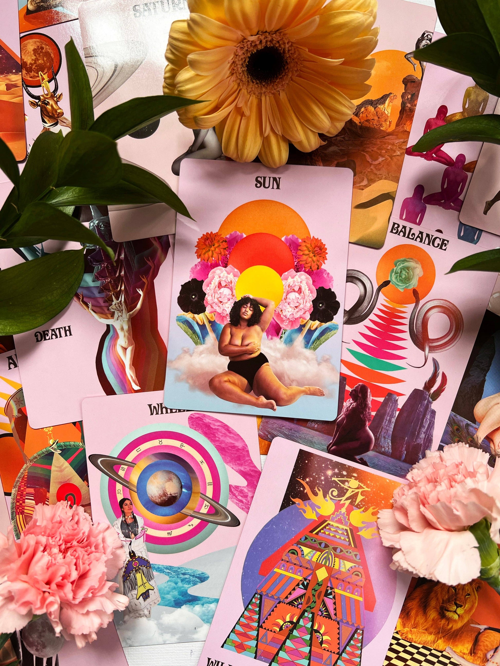 Themes of the Goddess archetype, desert dreamscapes and soft, pastel hues all work together in a visual dynamic that is clean, concise and impactful. This deck features dozens of women and a few men who elected to be a part of this ever-evolving project, embodying the archetypes with very little guidance - instead coming up with their own poses, and interpretations, of the tarot cards and their meanings. The result is a robust, organic body of work that comes together to celebrate not only the divine feminine but the human form. Instead of borders, each suit (cups, wands, pentacles, swords) has its own subtle, muted pastel color as a base. If you fan out the cards from 0-The Fool to Ten of Pentacles, you will see a soft rainbow! 4th edition