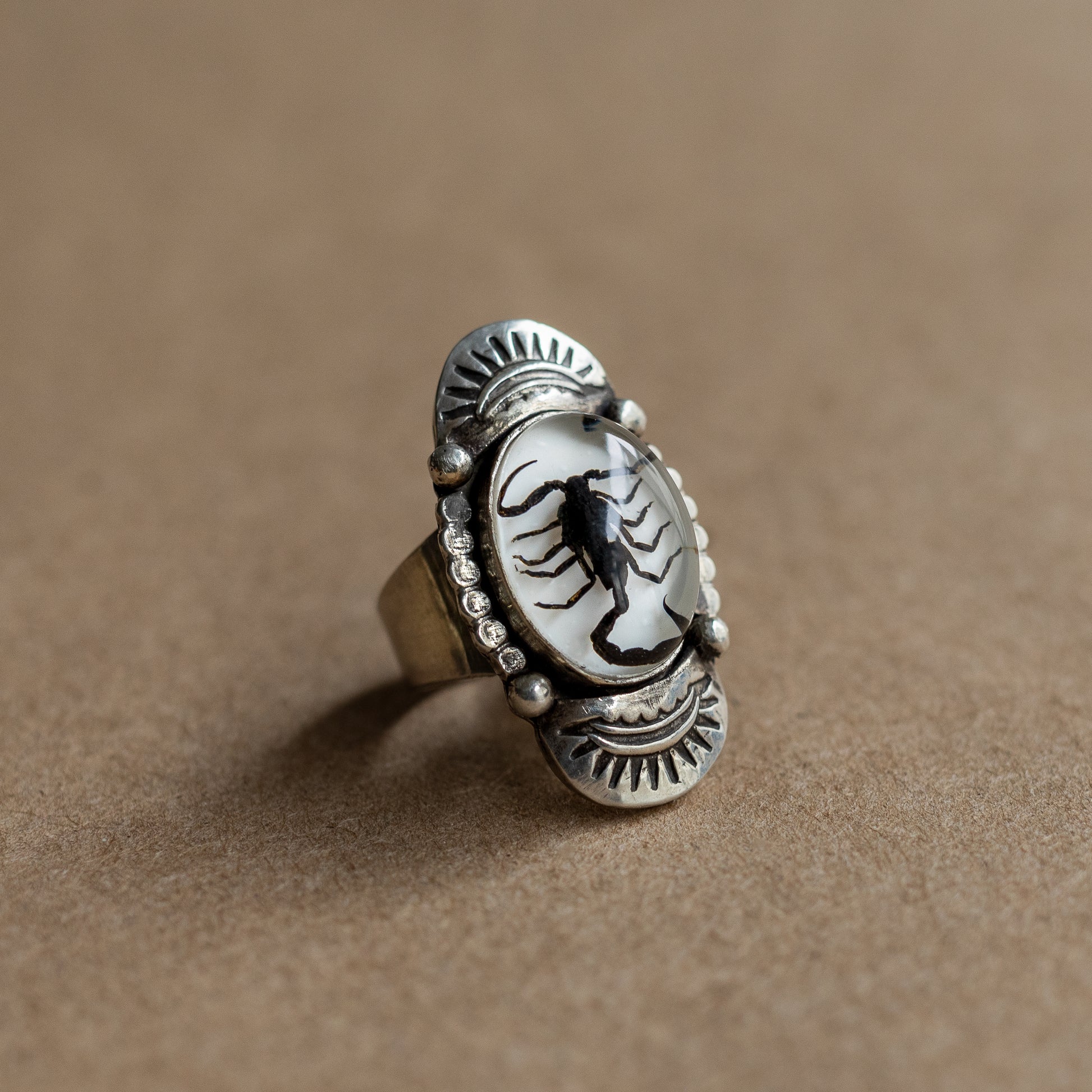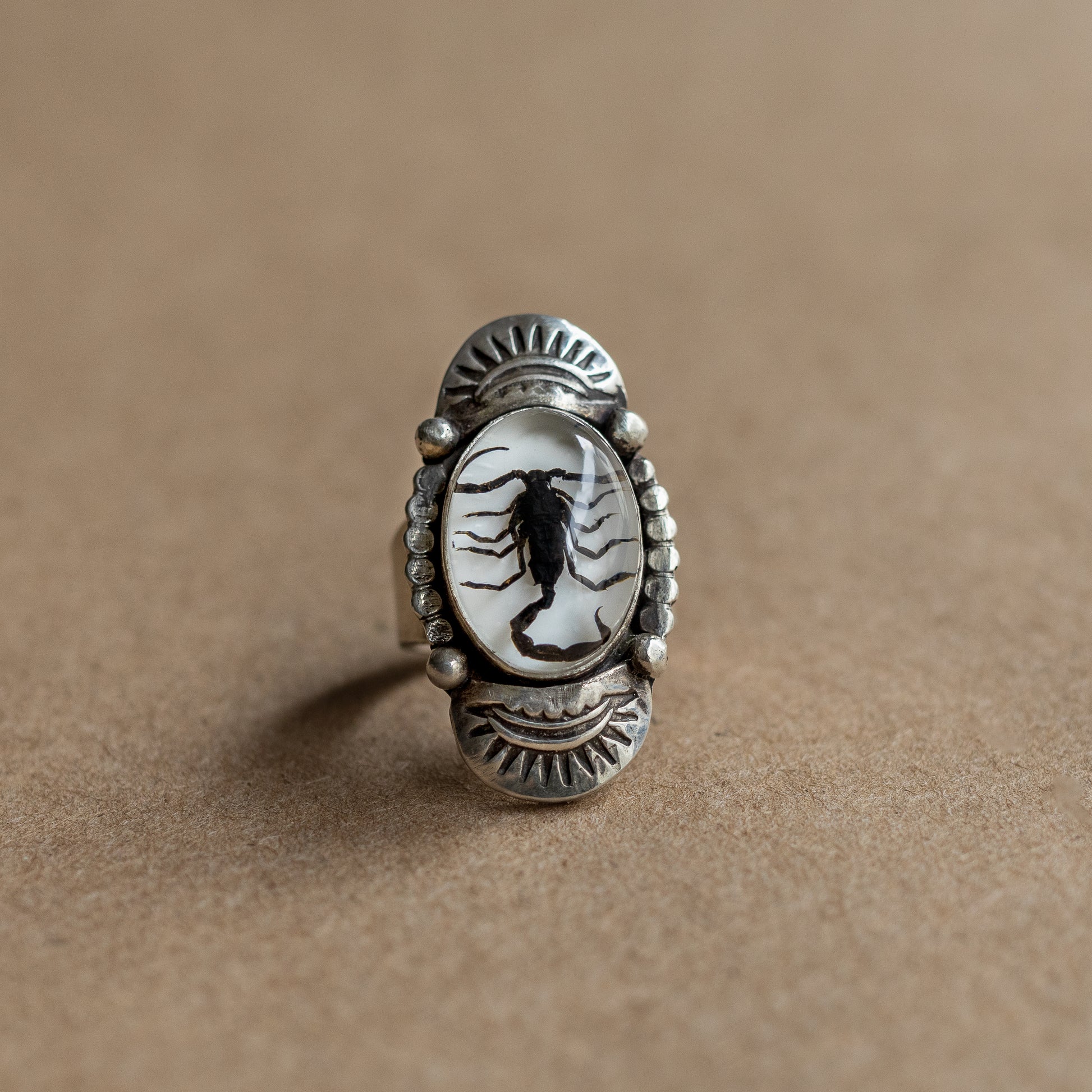 A black scorpion set in resin and surrounded by silver sun bursts. Ring is slightly over 1 3/8" tall, and is available in multiple sizes.