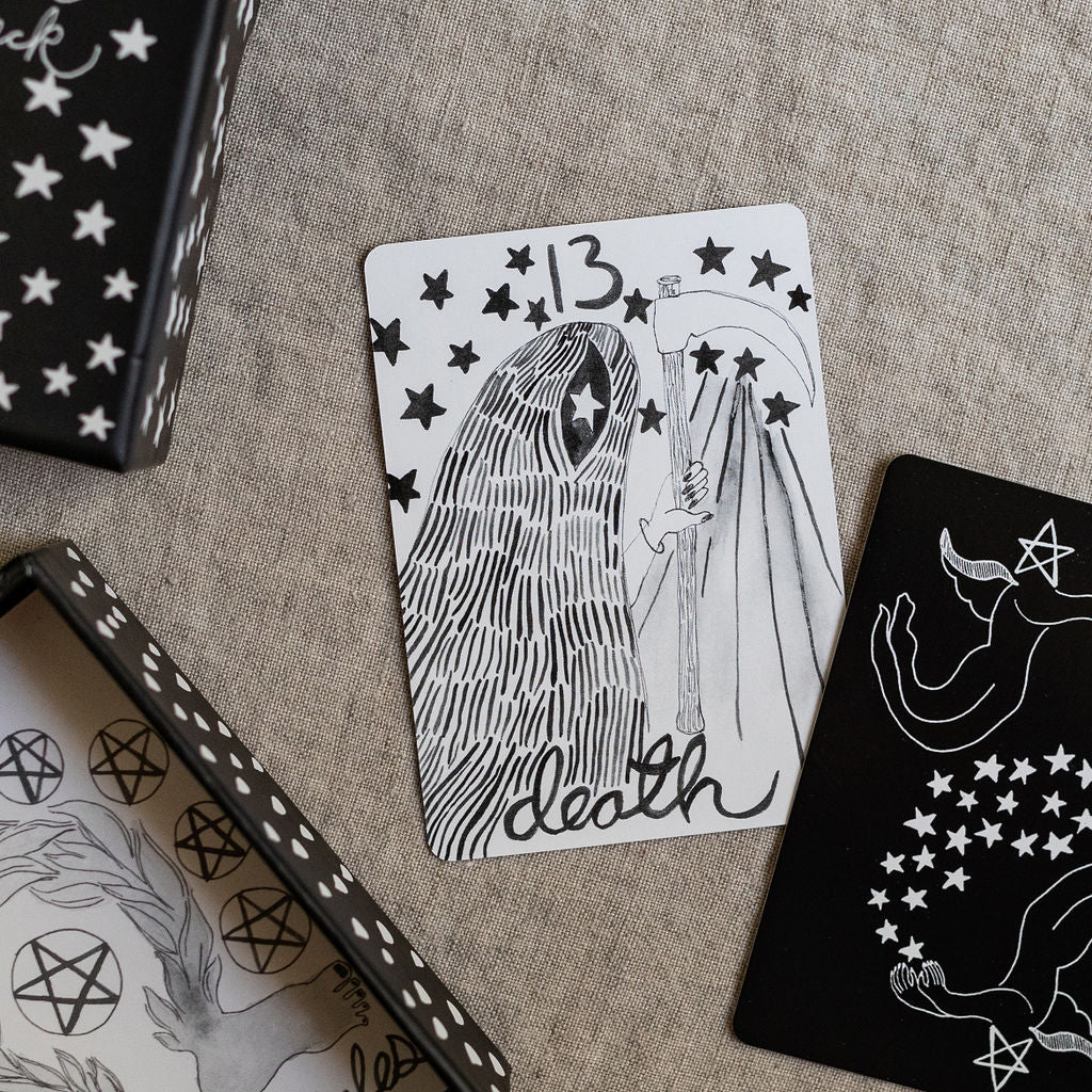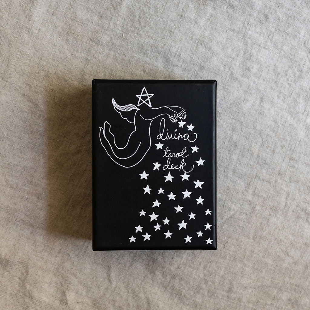 The DIVINA Tarot Deck was made to serve as a sequel to the original SPIRIT SPEAK Tarot Deck. Divina is playful and gentle in its approach to the tarot archetypes. Filled with images of floating star angels and wispy gestures, Divina delivers information with loving care. These whimsical images were created by artist Mary Elizabeth Evans with pen, ink, and greyscale watercolor.