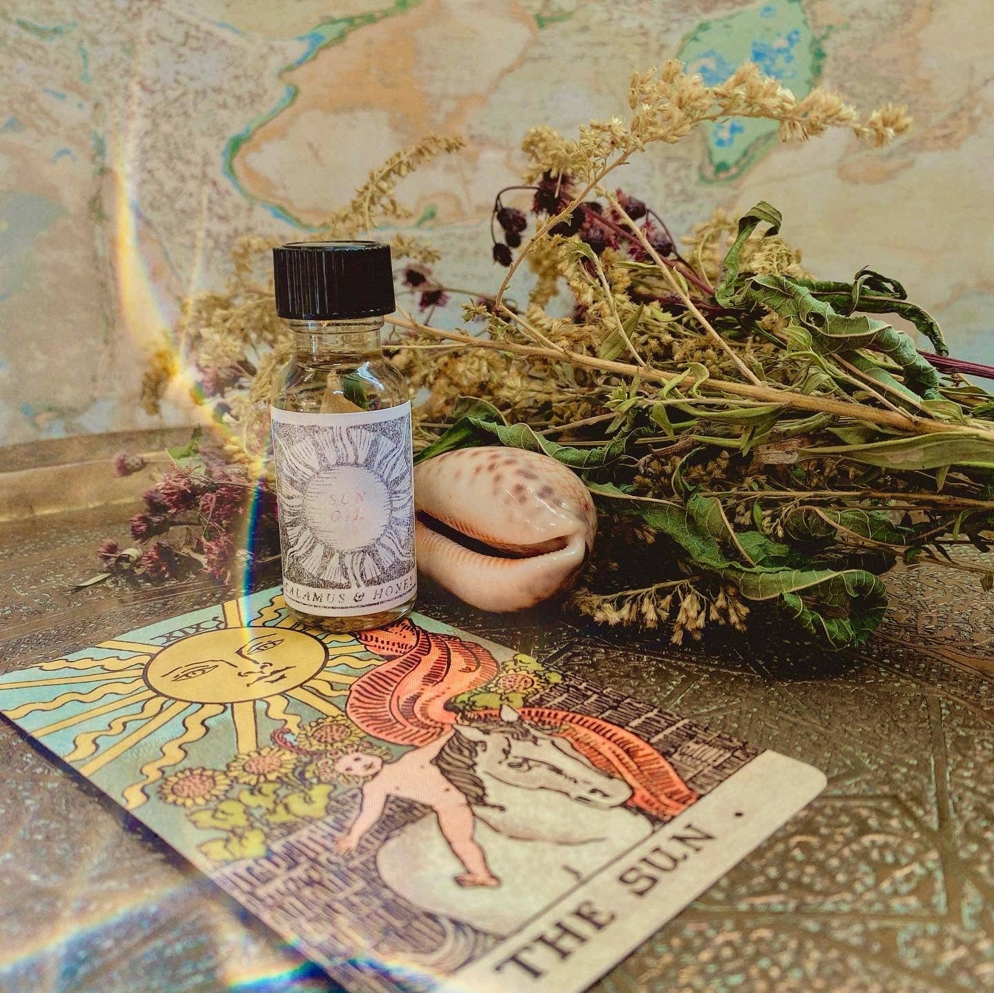 This oil captures the essence and power of the sun to be used in your solar centered workings. Can be used for prosperity, growth and expansion, increase in vitality, birth, fame , recognition, renewal, illumination, warming a space, bringing in positivity, moving things into action, and positive masculine energy. Anoint yourself with this oil for a mid day pick me up when your energy is low or dress a candle with it. Handcrafted with powerful herbs associated with the sun as well as real gold leaf. Includes gold leaf , cassia essential oil, frankincense, bay essential oil and other ingredients. Disclaimer: Contains essential oils. A skin test is recommended prior to use. Do not ingest. We have not had any issues thus far. However, we are not responsible for any reactions you may have to our products.