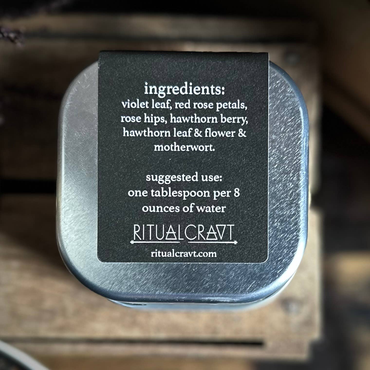 Ingredients: violet leaf, red rose petals, rose hips, hawthorn berry, hawthorn leaf & flower, and motherwort.