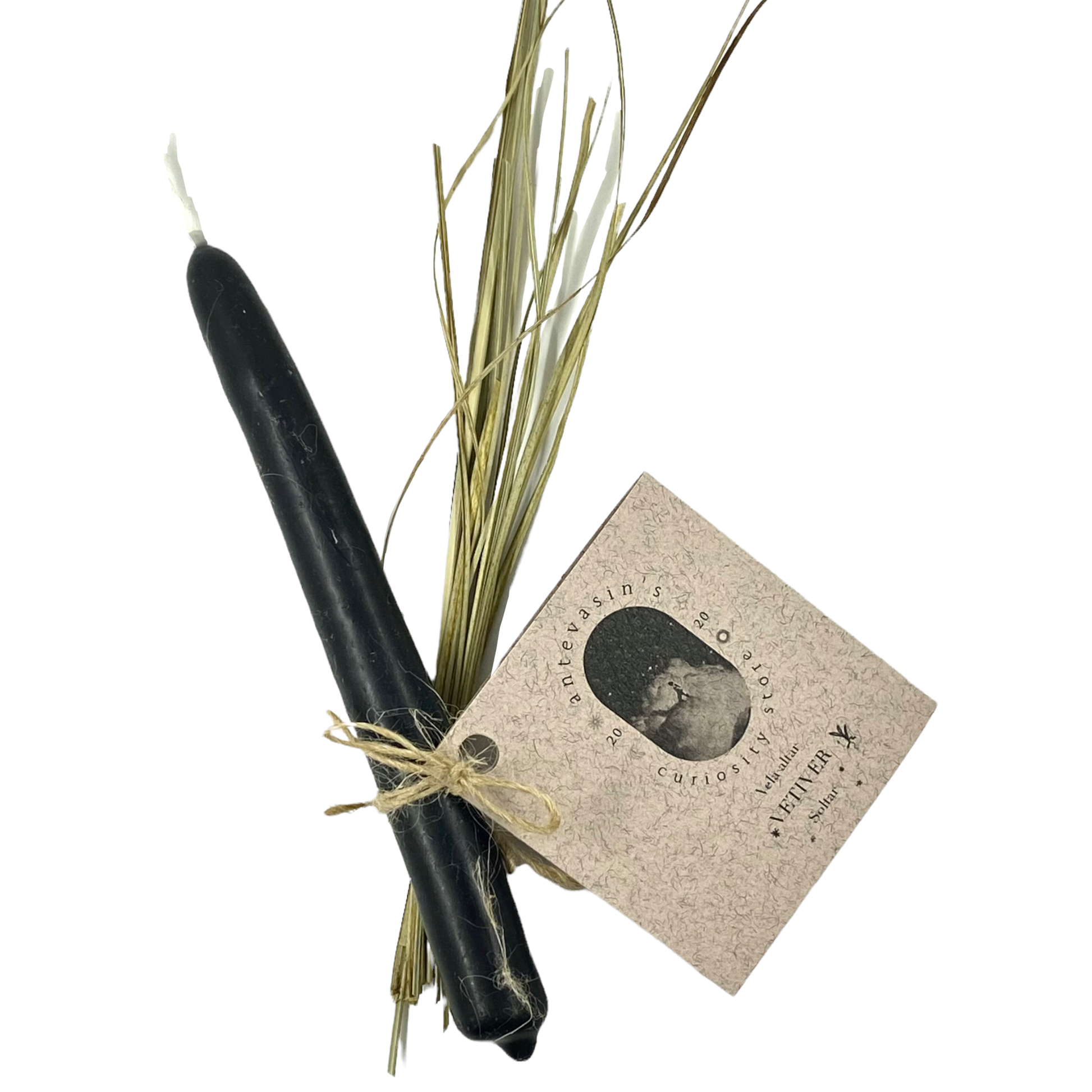 The black candle is by pagan tradition an enormous energy cleanser and a great ally of protection when it comes to doing our rituals. Prepared with Vetiver essential oil, a sacred plant that is said to “open paths” and keeps evil away from the space in which it is used. This candle has black Mica powder, to give a bright touch to the heart of the candle, symbolizing light.