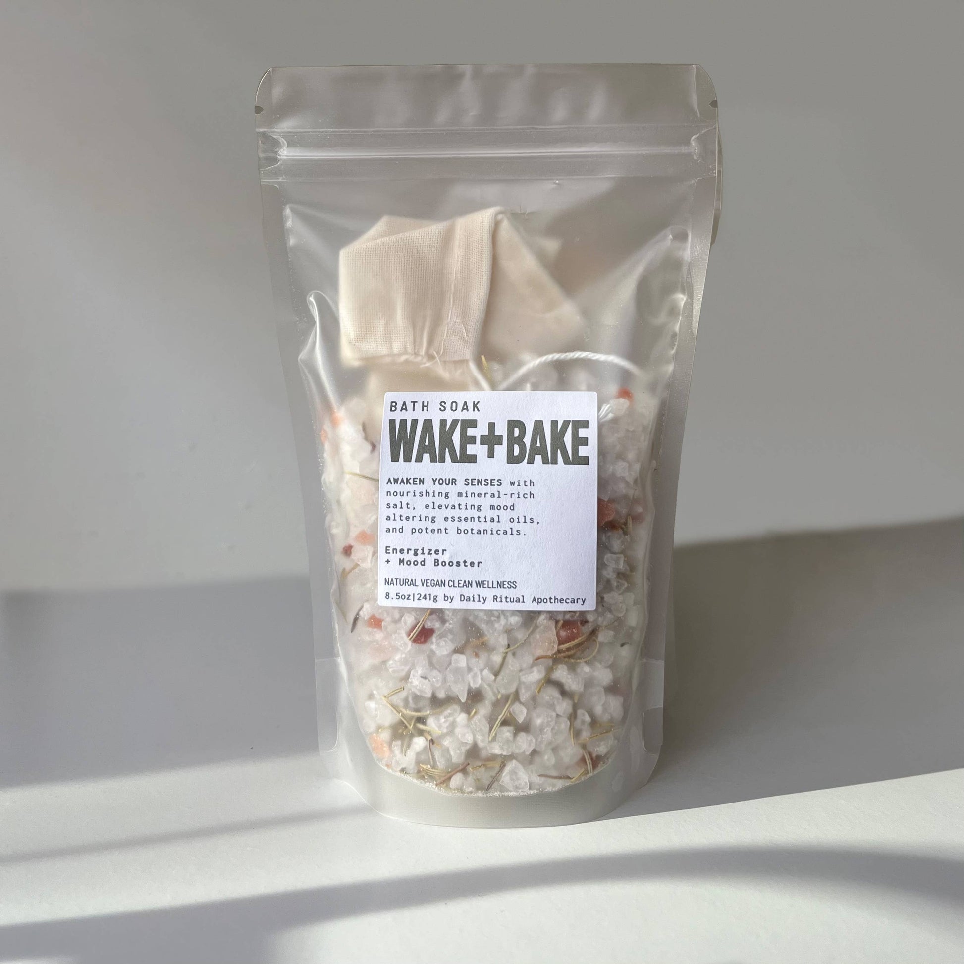 Feel like you’re in need of an energy boost? Wake + Bake Bath Soak is here to give you just that. A blend of essential oils, natural salts and botanical ingredients create a soak that gets you out of bed and ready to tackle the day. The lemon + eucalyptus scent is sure to transport you away from bedtime and into your morning routine. Made in small batches using all natural essential oils and botanicals. Includes reusable cotton pouch.